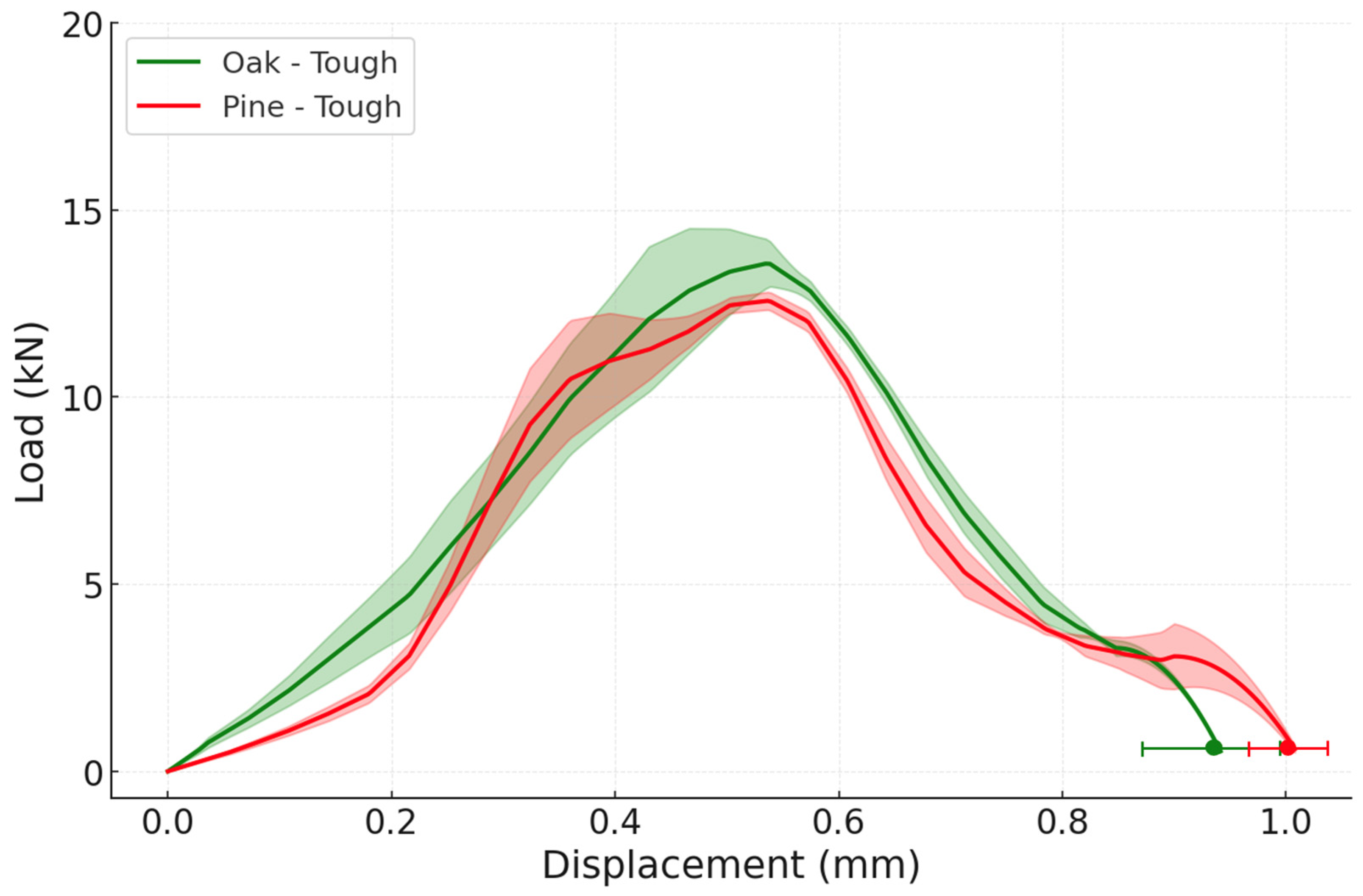 Figure 13 presents a comparison of the experimental load-displacement curves between both wood species (pine and oak), presenting the aforementioned results.