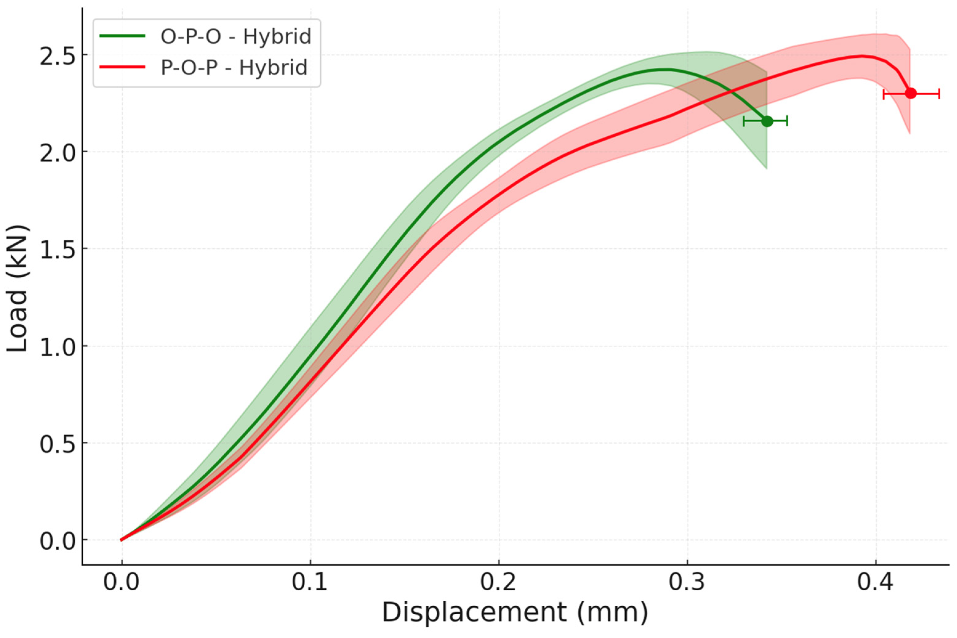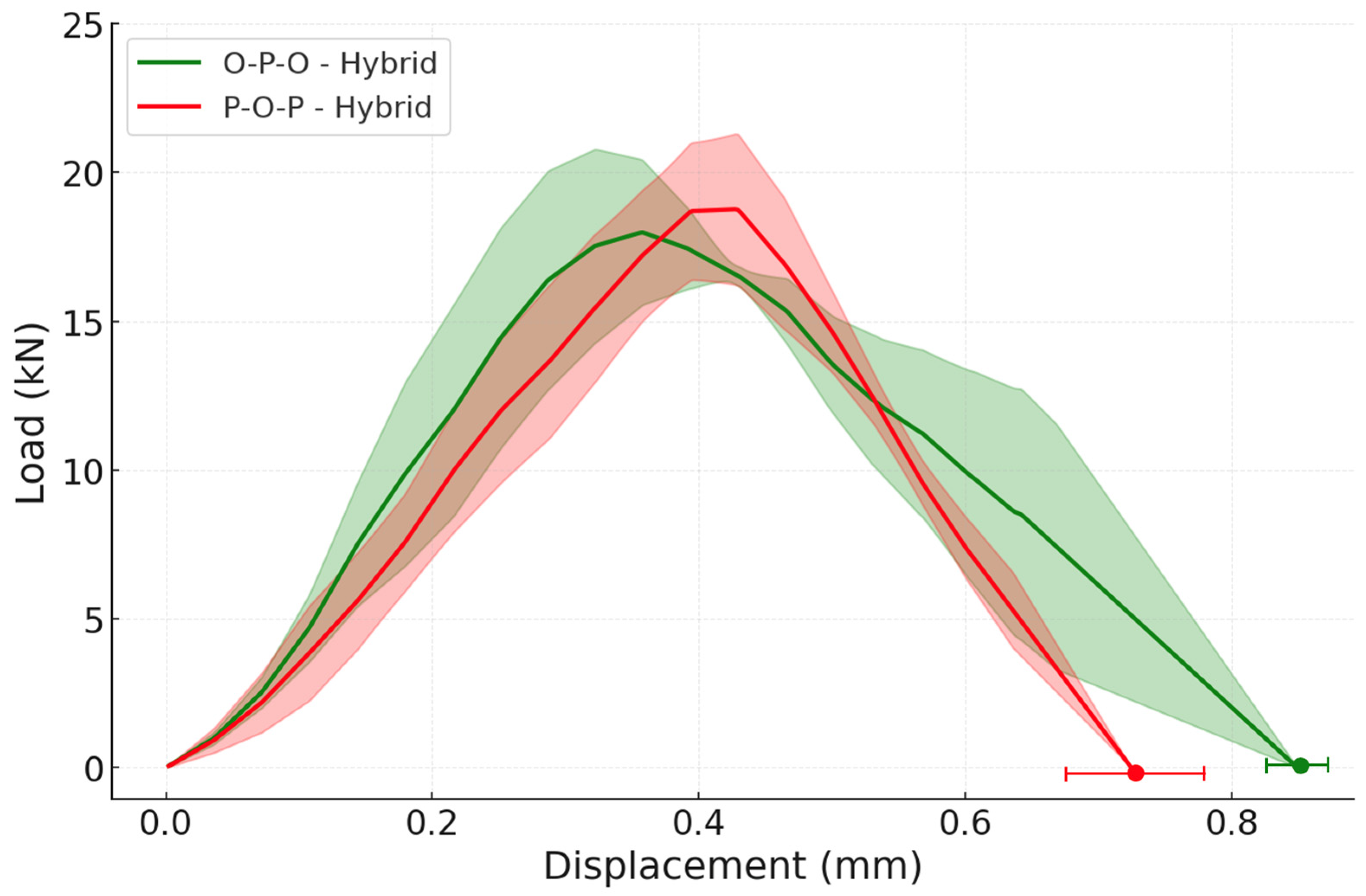 For instance, the O-P-O hybrid exhibited a failure load of 18.04 ± 1.81 kN and the P-O-P hybrid displays a failure load of 18.84 ± 2.32 kN; these results represent, for the O-P-O configuration, a 33 ± 22% increase when compared with the reference oak and a 76 ± 23% gain when compared with the reference pine and for the P-O-P configuration, a 39 ± 24% improvement when weighed against oak reference specimens and a 84 ± 28% increase when contrasted against the pine reference. The results are shown in the load-displacement graph of