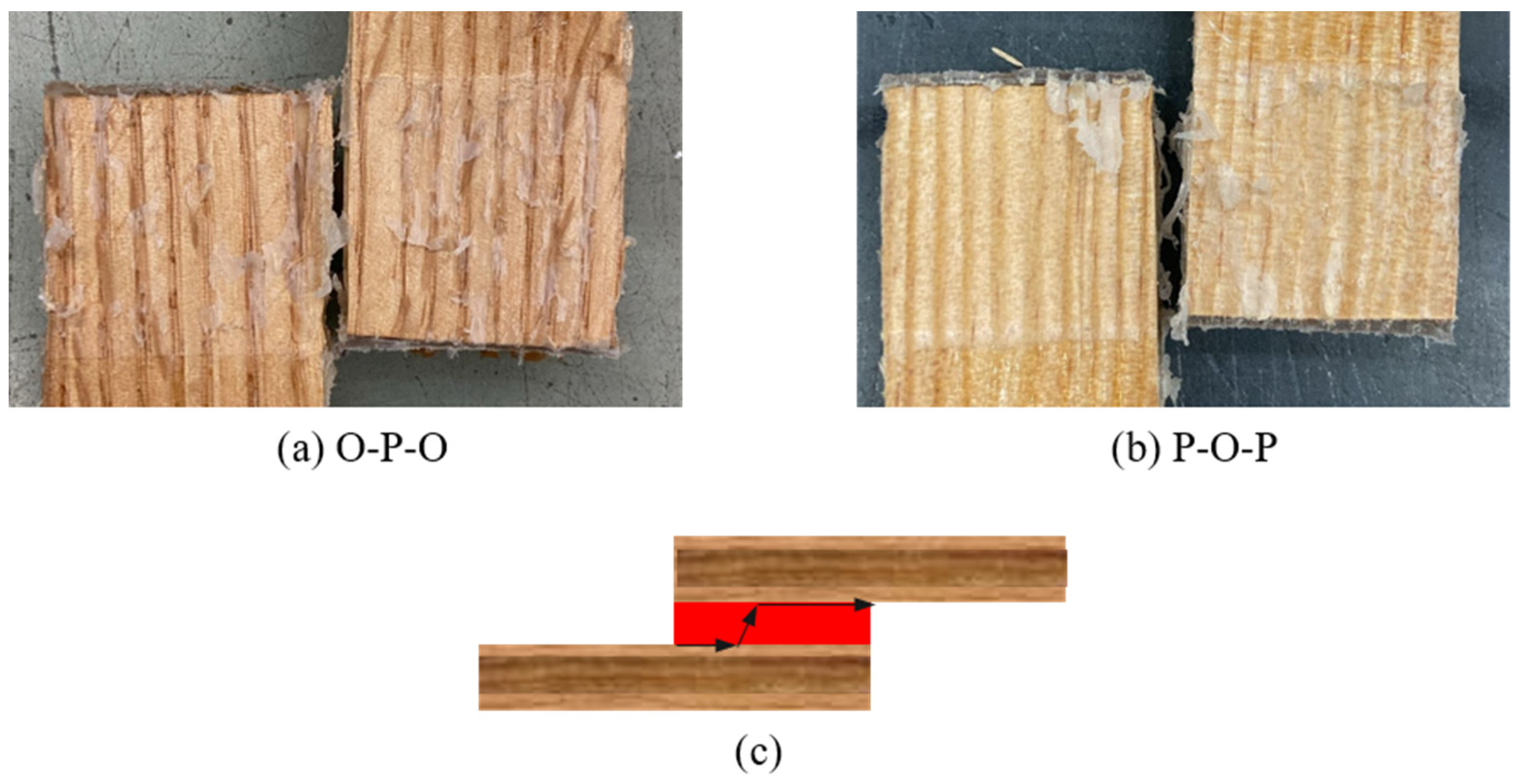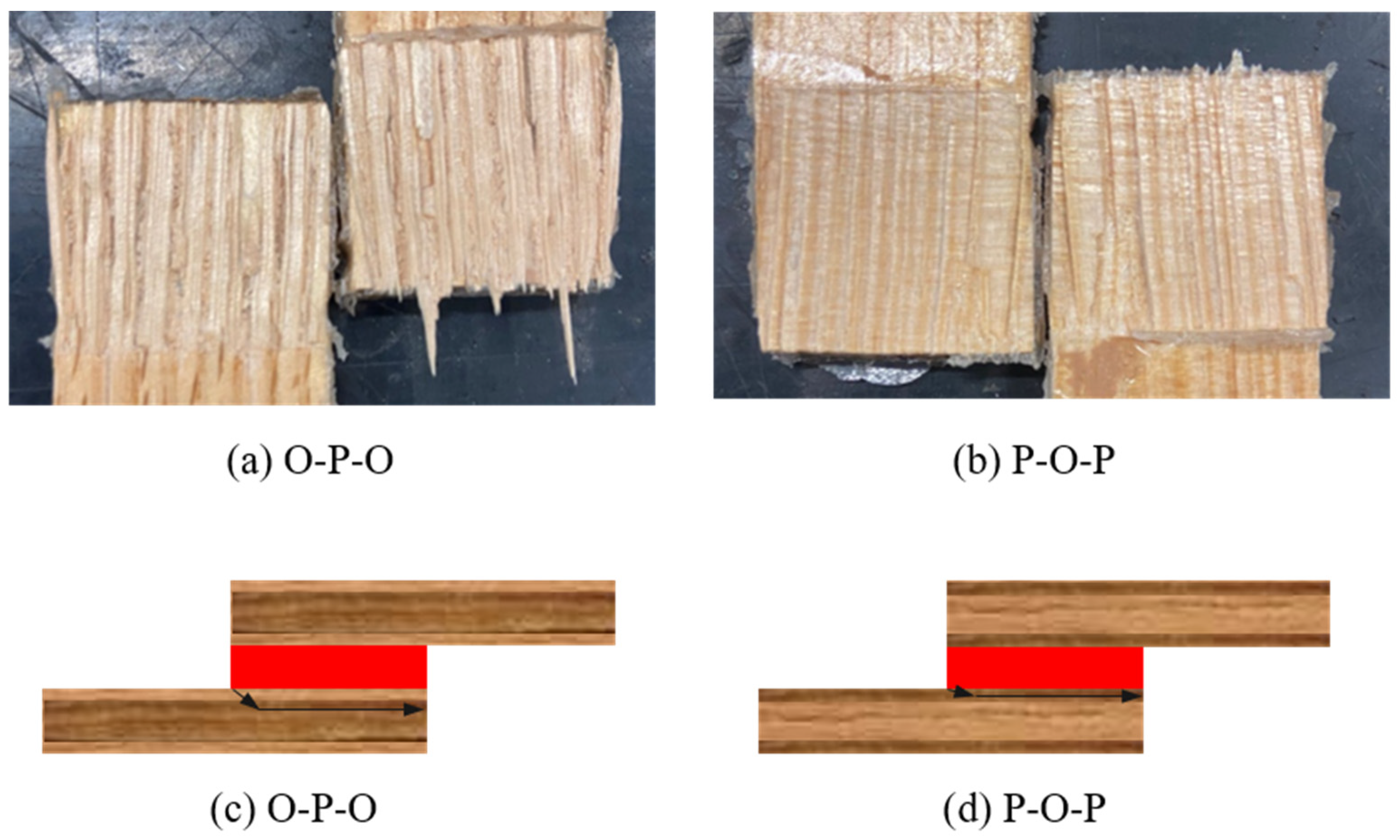 Figure 3). Two thickness arrangements were manufactured: (i) oak in the core (4 mm) with pine plies on the outer surfaces (1 mm each), forming an O-P-O configuration, and (ii) pine in the core (4 mm) with oak plies on the outer surfaces (1 mm each), forming a P-O-P configuration. Adhesive layers were applied between the different wood plies, with penetration further strengthening the interlaminar regions. The hybrid design was intended to improve stress distribution along the overlap length and increase the overall load-bearing efficiency of the joints.