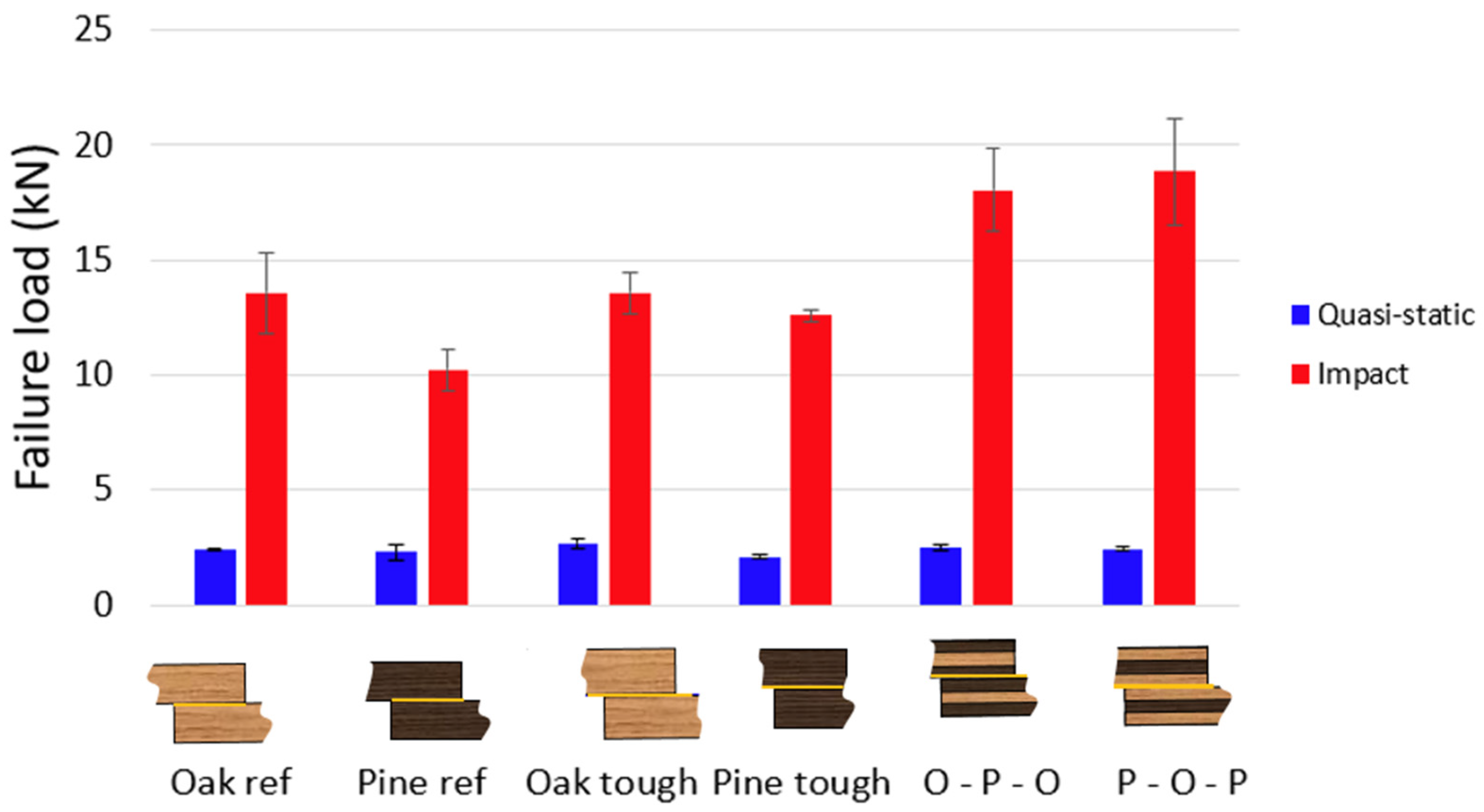 Figure 21 provides a concise overview of the quasi-static performance of all tested configurations with respect to failure load. It is worth noting that all joints tested under quasi-static loading failed adhesively, which helps explain the similarity of the results and the limited influence of the toughened and hybrid configurations, since the strength is mostly governed by the wood-adhesive interface rather than by the substrate reinforcement strategy.