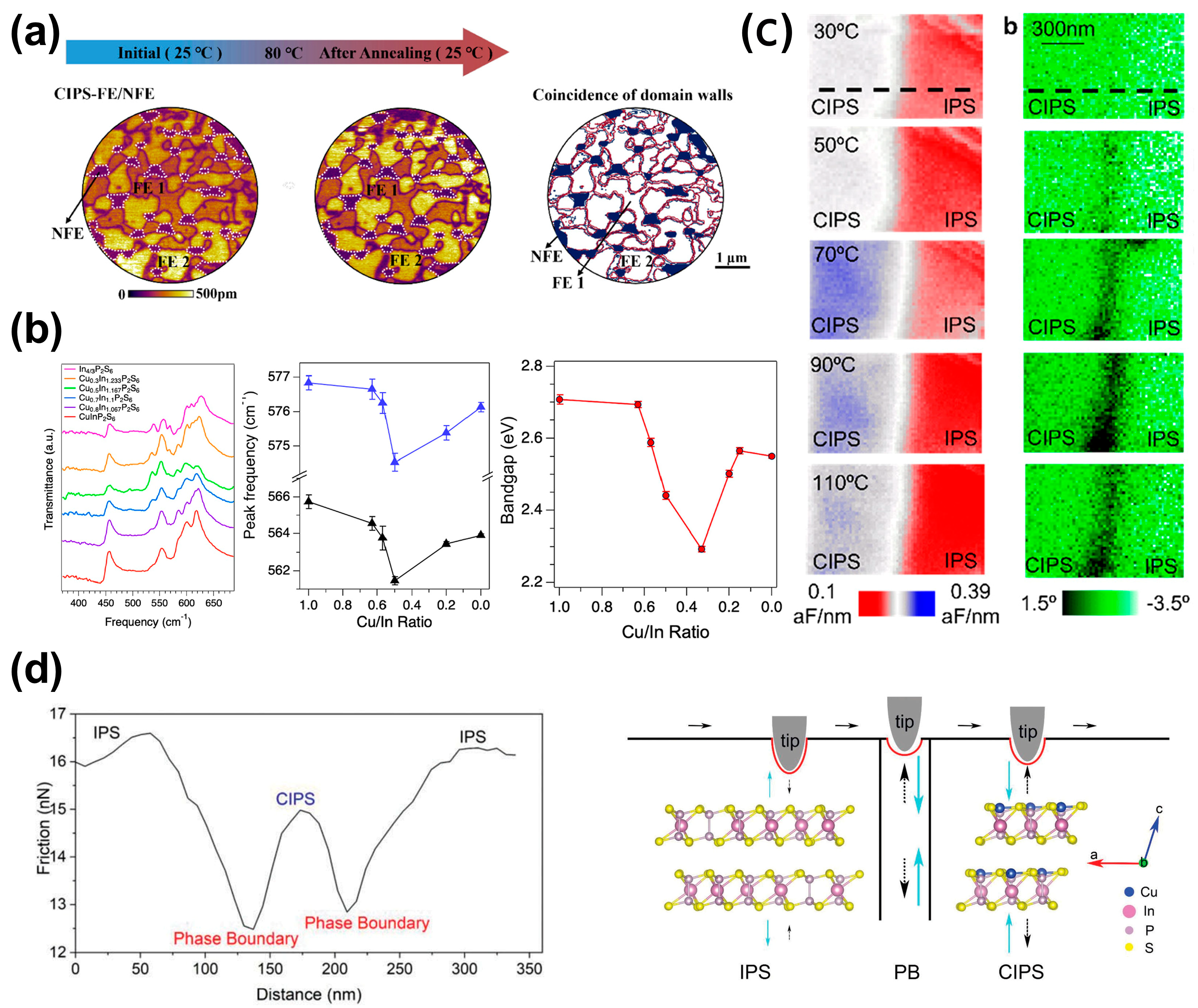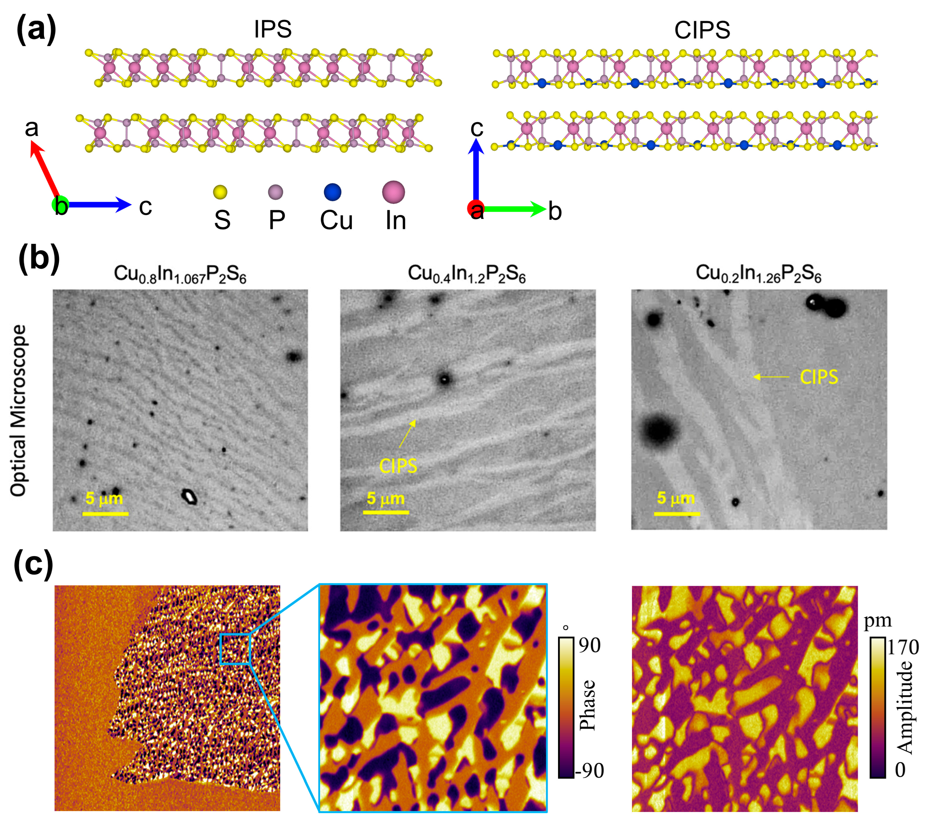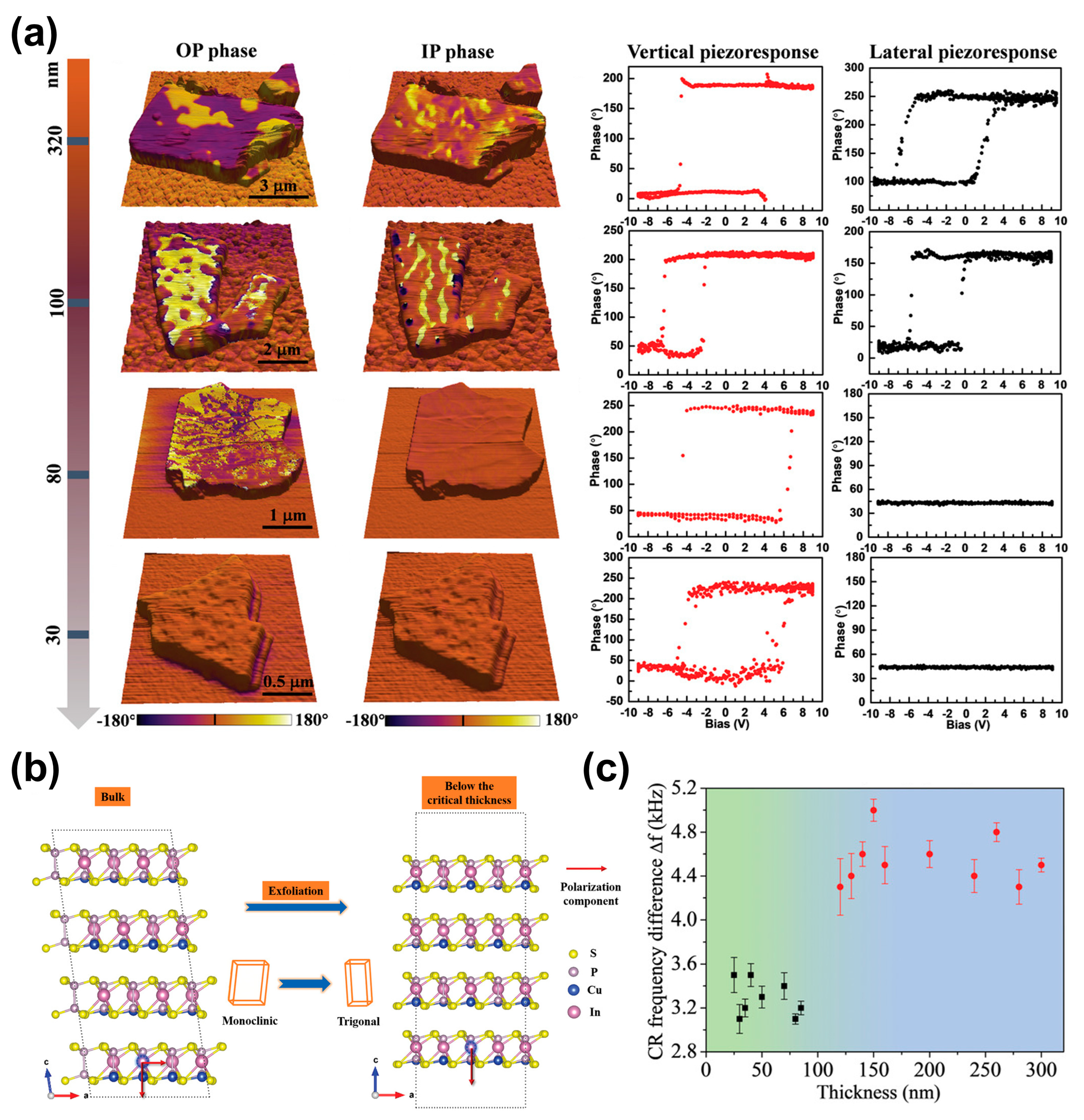 | Cu0.9In0.99P2S5.9 | 8–200 nm | Au-covered silicon | Monoclinic Cc (No. 9) | √ | √ | Vector-PFM | [38] |