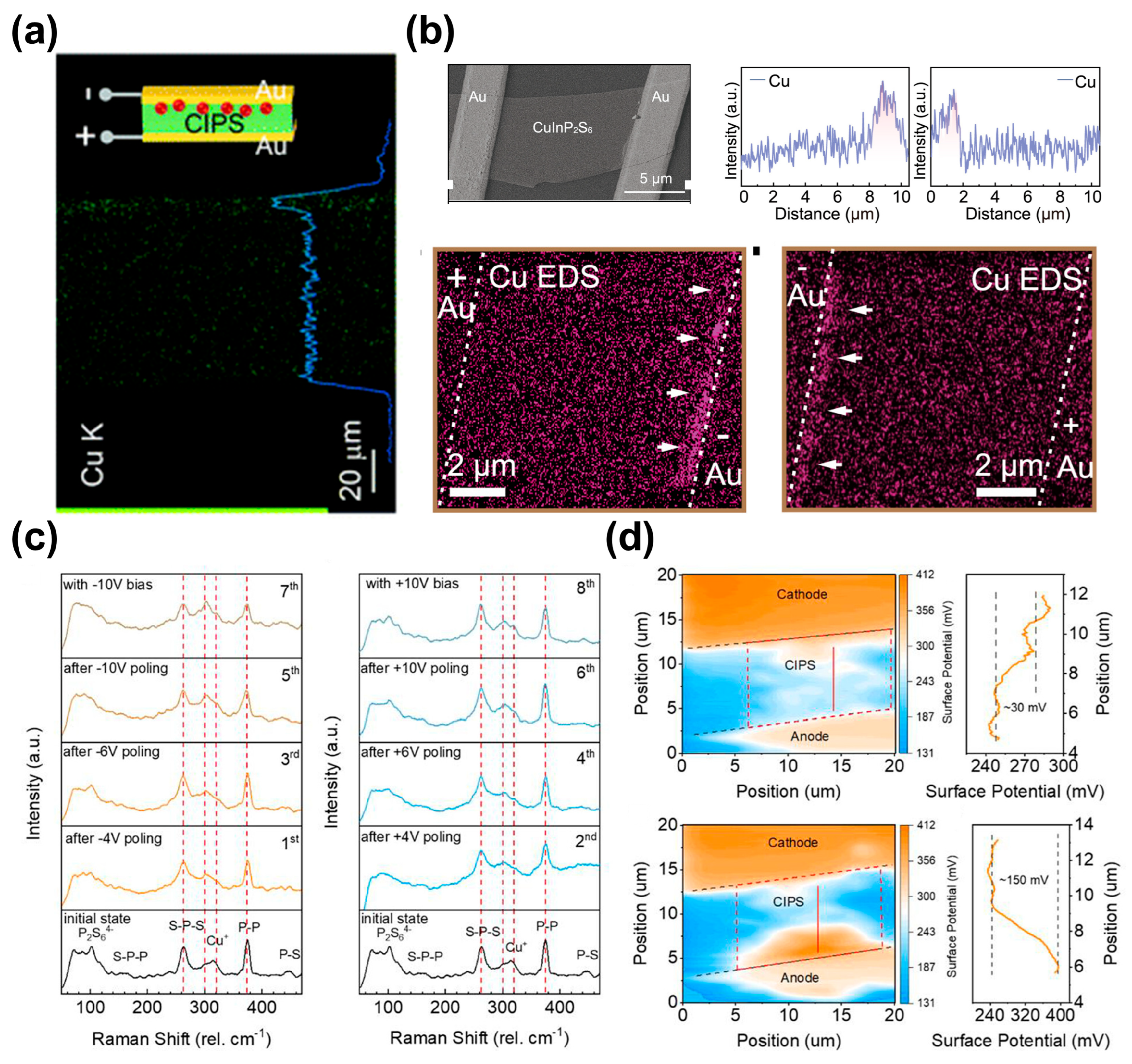 - Guo, C.; Zhu, J.; Liang, X.; Wen, C.; Xie, J.; Gu, C.; Hu, W. Atomic-level direct imaging for Cu (I) multiple occupations and migration in 2D ferroelectric CuInP2S6. Nat. Commun. 2024, 15, 10152. [Google Scholar] [CrossRef]