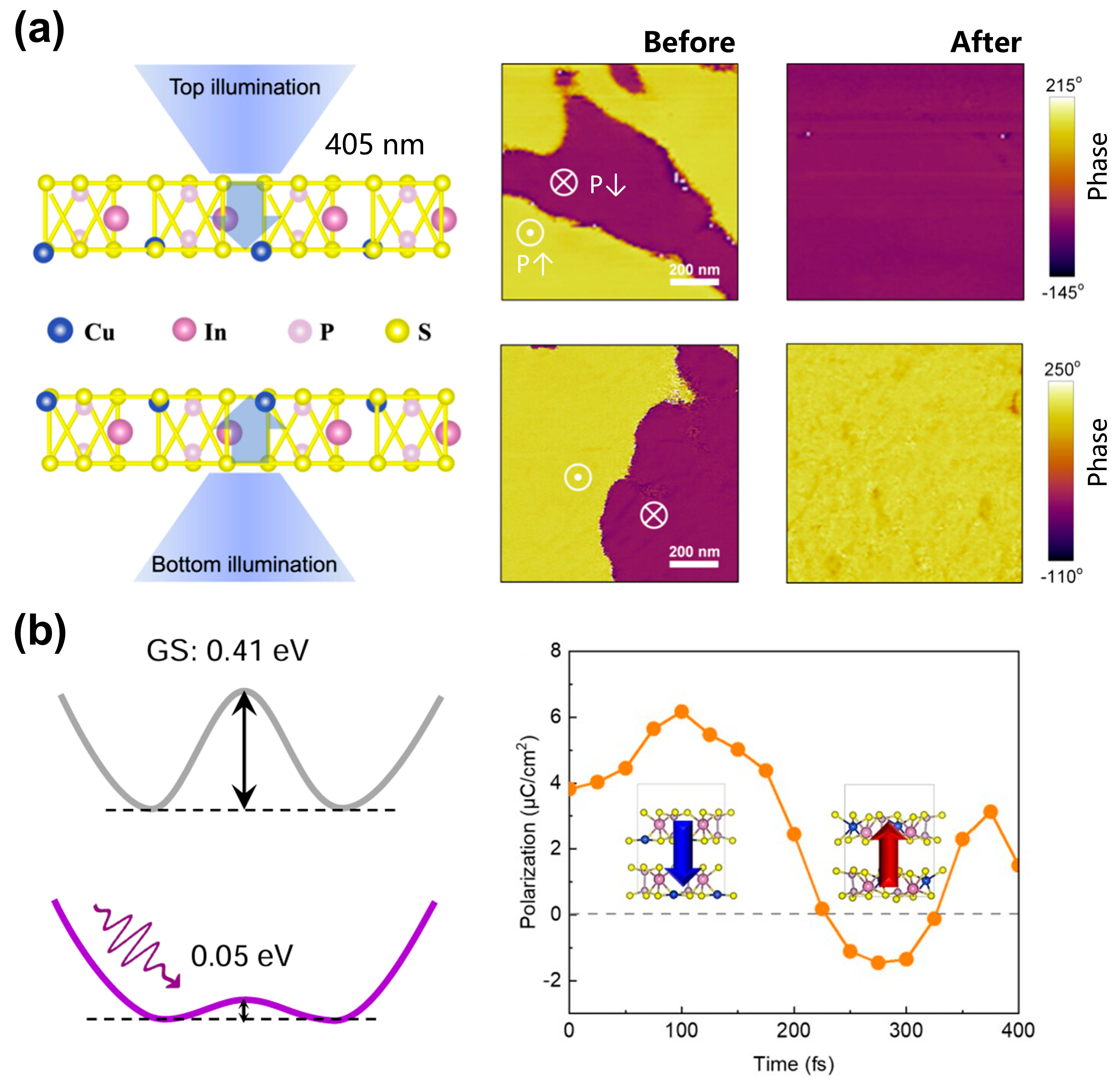 - Zhang, J.; Yang, K.; Yu, J.; Wan, H.; Zhang, J.; Fu, H.; Ding, Z.; Shi, X.; Meng, S. Ultrafast polarization switching via laser-activated ionic migration in ferroelectric CuInP2S6. Phys. Rev. B 2025, 111, 104111. [Google Scholar] [CrossRef]