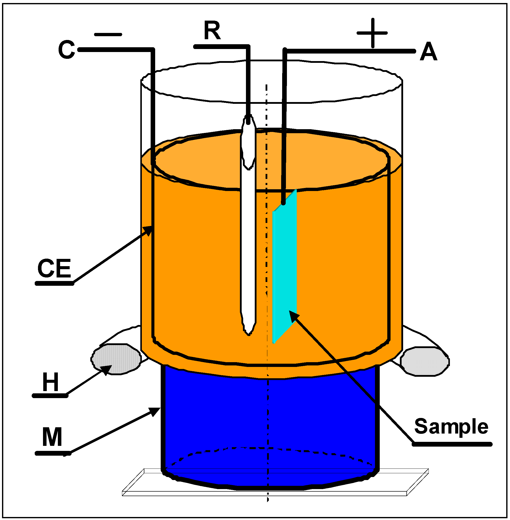 Magnetoelectropolishing MEP system used for investigation of polarization characteristics: A – anode, C – cathode, R – reference electrode, CE – counter electrode of cylindrical shape, CE – counter electrode, M – permanent magnet, H – heater.