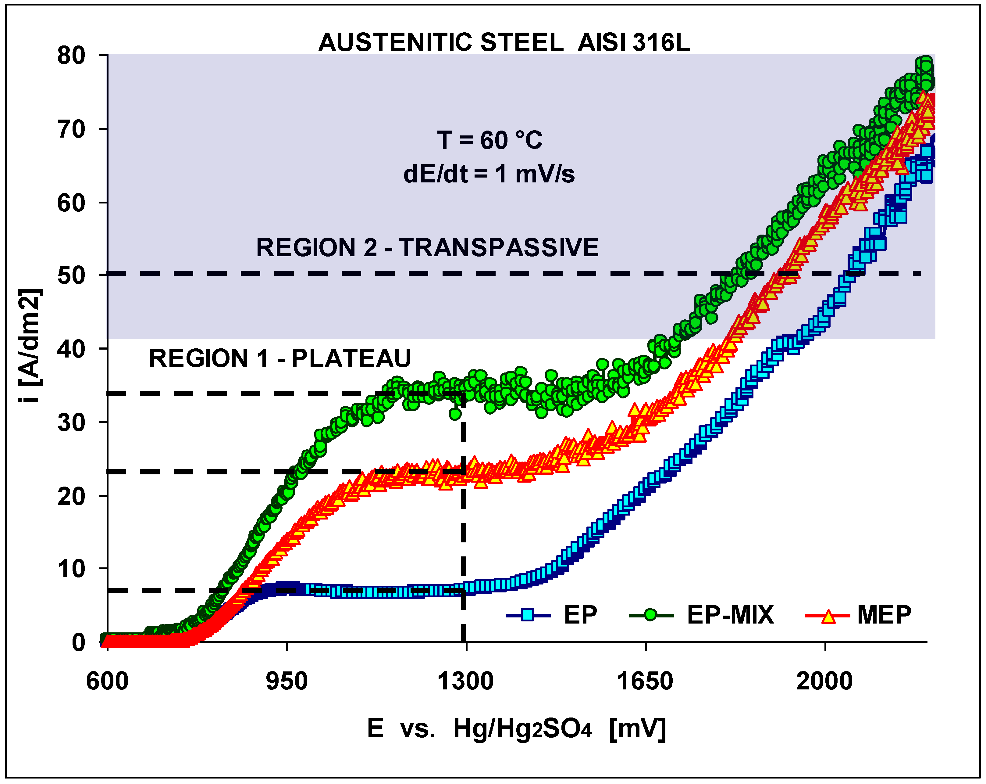 Electropolishing polarization characteristics obtained on AISI 316L SS dependent on treatment conditions (EP, EP with moderate mixing, and MEP) presenting two regions: 1 – plateau, 2 – transpassive. The semi-shadowed current density area of typical industrial applications has been indicated.