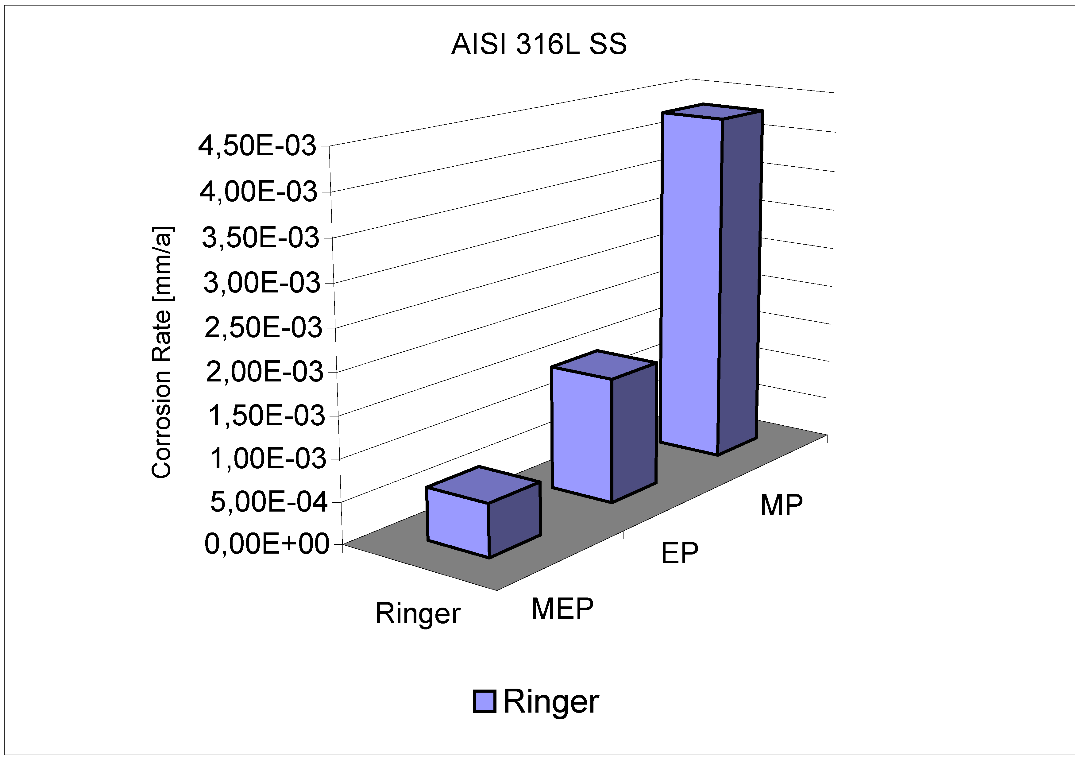 Comparison of corrosion rates of AISI 316L SS in Ringer’s solution after treatment by: MP – abrasive polishing (grit size 800), EP – standard electropolishing, MEP – magnetoelectropolishing [1,27].