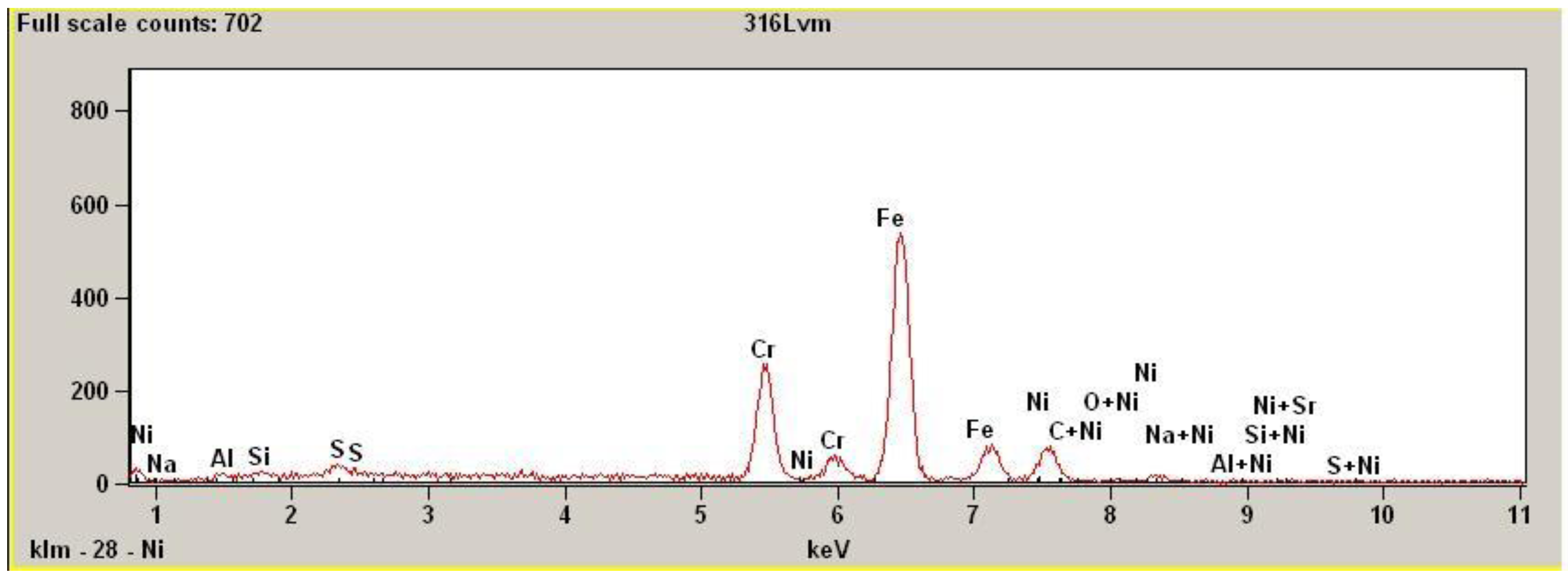 - Kerber, J.S.; Tverberg, J. Stainless Steel Surface Analysis. Adv. Mater. Processes 2000, 33–36. [Google Scholar]