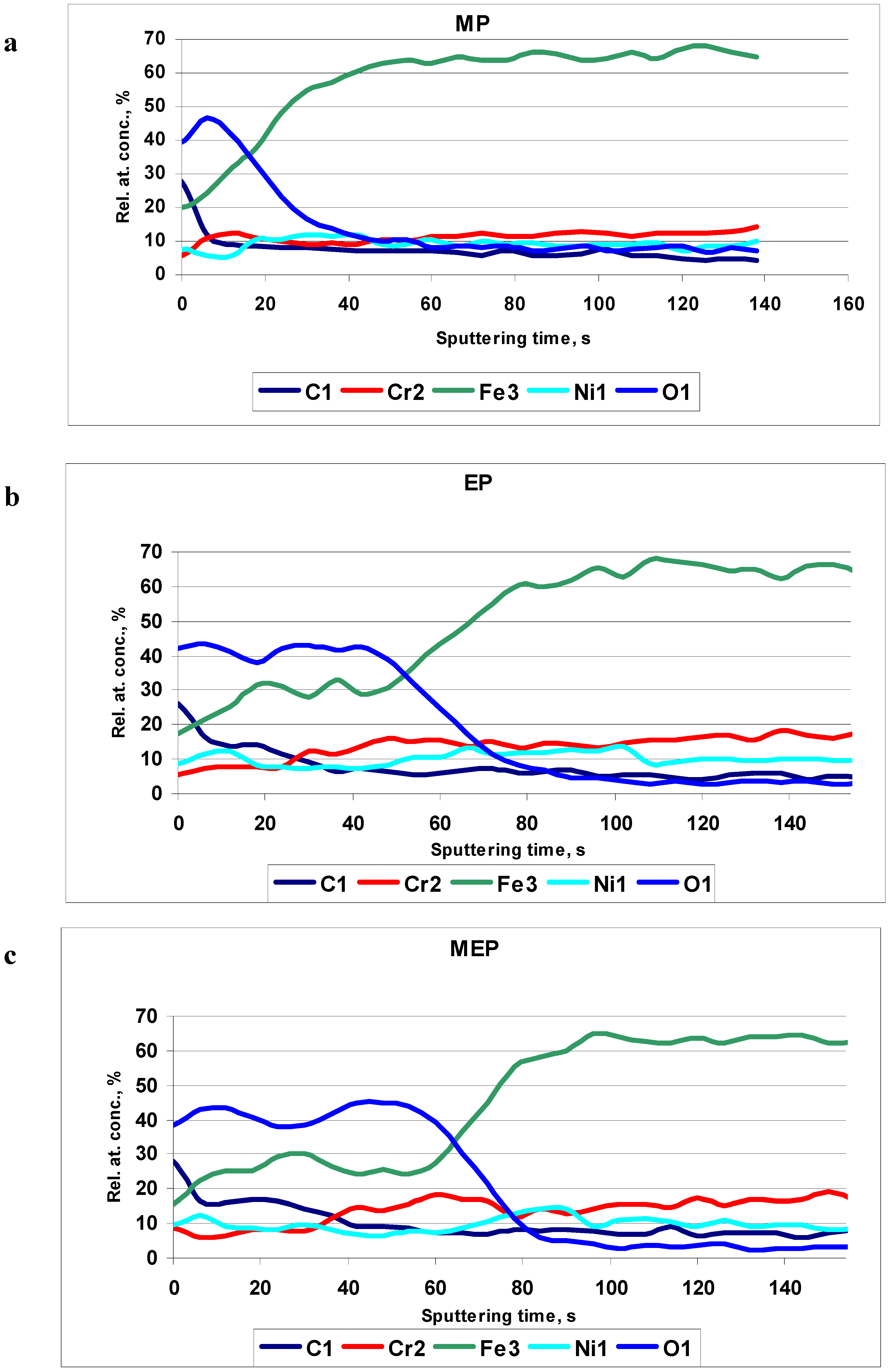 AES results of 316L SS surfaces after: (a) MP – abrasive polishing, (b) EP – standard electrolytic polishing, and (c) MEP – magnetoelectropolishing.