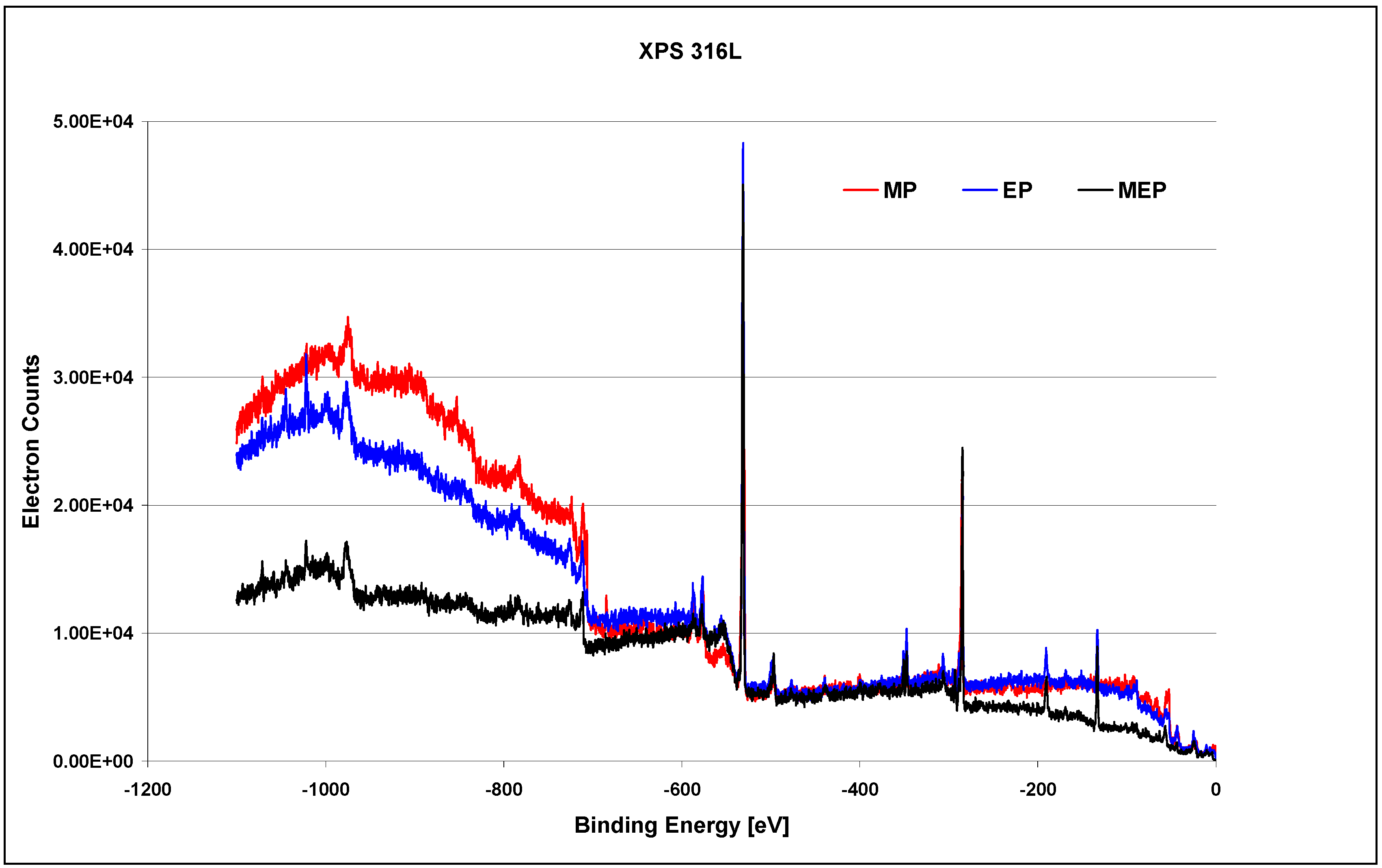 The XPS studies on 316L SS samples, after MP, EP, and MEP have been carried out within the binding energy of −1100 eV to 0 eV and the general results are presented in Figure 8 [26]. One may notice here different surface compositions after each of sample surface treatment, beginning from the sample after MP, then after EP, and next after MEP.