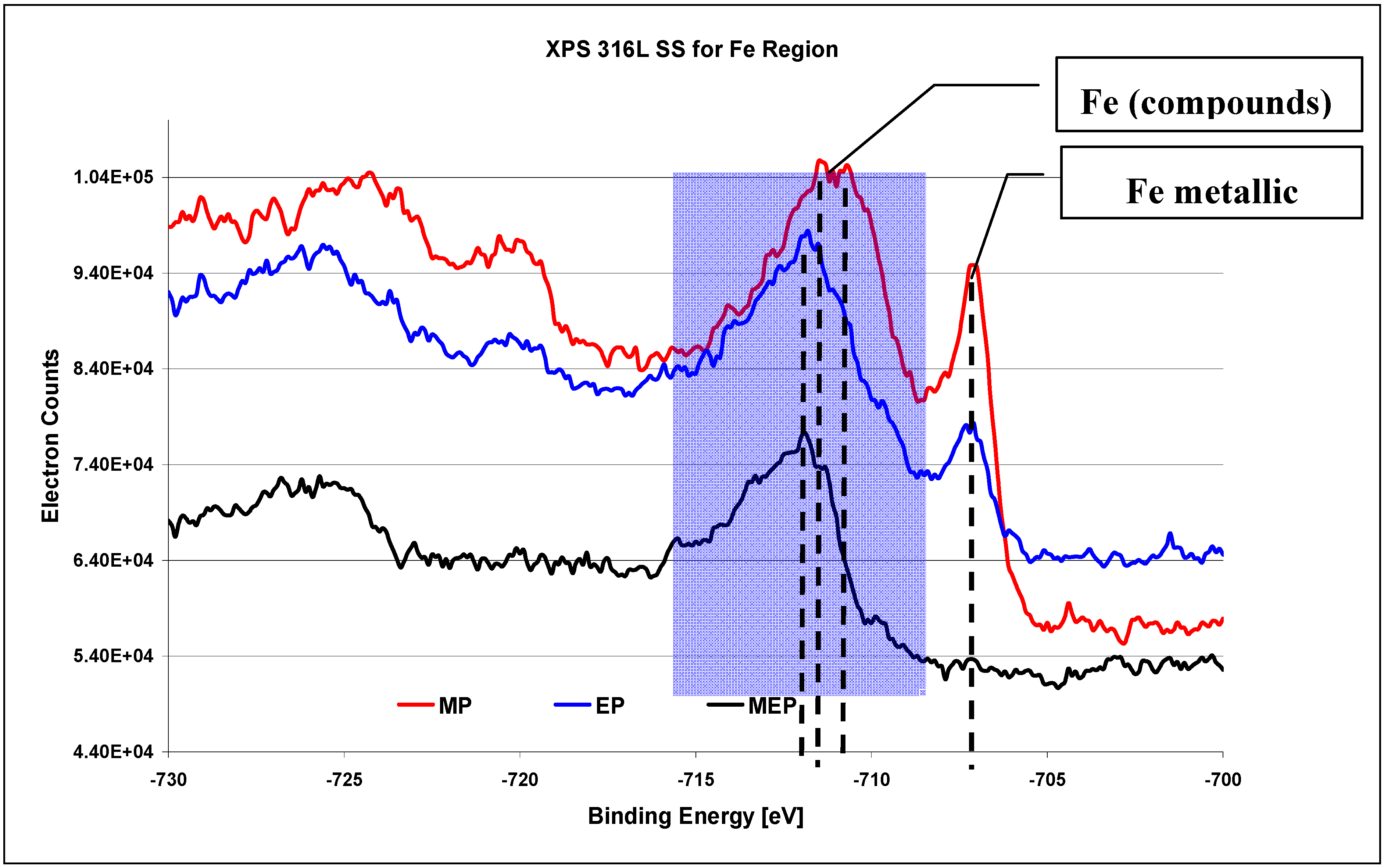 XPS results for Fe region of 316L SS surfaces after: MP – abrasive polishing, EP – standard electrolytic polishing, and MEP – magnetoelectropolishing [26].