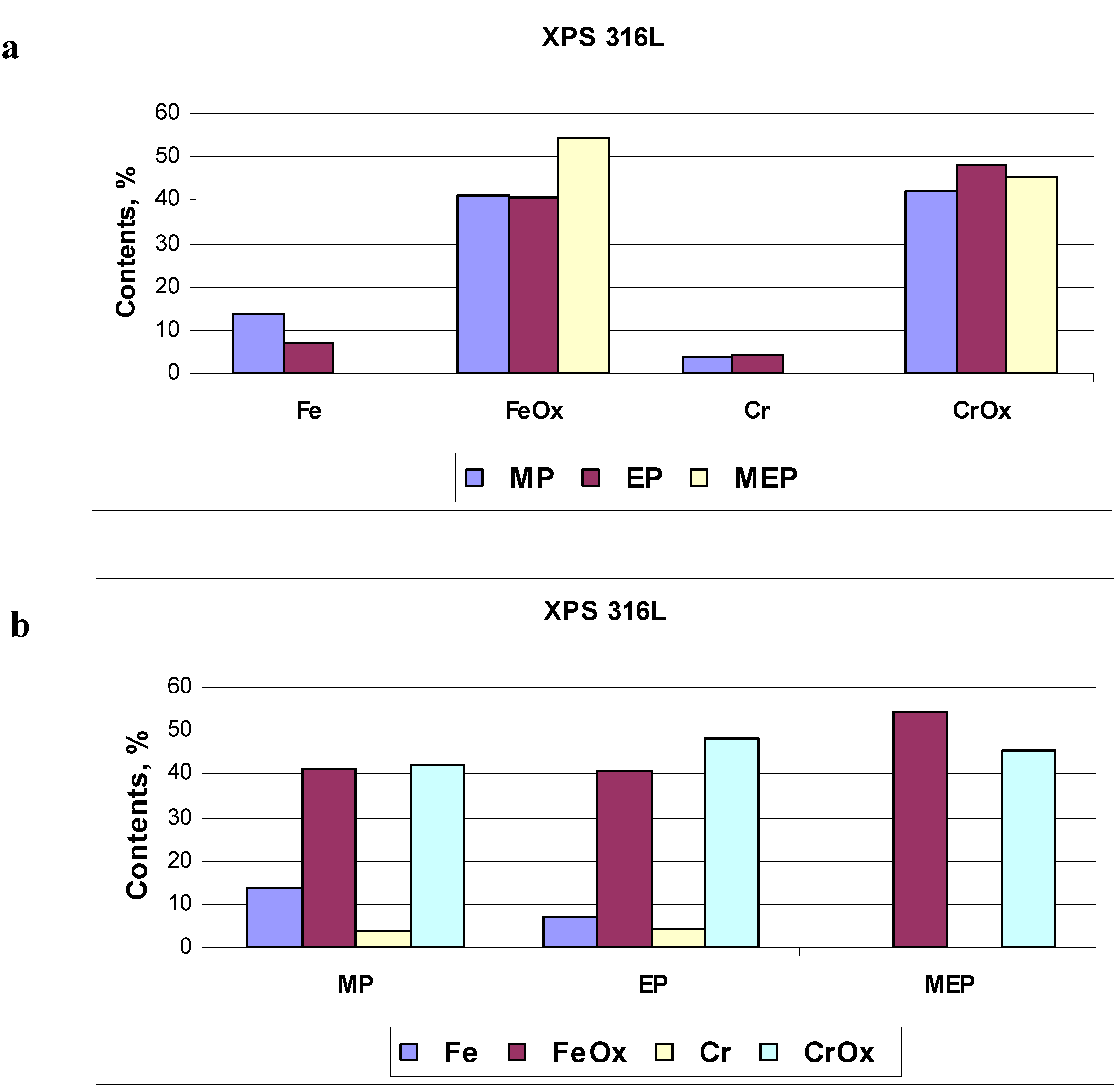 The numerical amounts of oxides and pure metal atoms on 316L SS samples, after MP, EP, and MEP have been presented in Figure 11. In Figure 11a the percentage contents of particular elements of the surface film (Fe, FeOx, Cr, CrOx) is presented indicating no free metal atoms contents after magnetoelectropolishing MEP. In Figure 11b one may notice no free iron atoms on the sample surface after MEP, beside from no free chromium atoms independent on the kind of treatment.