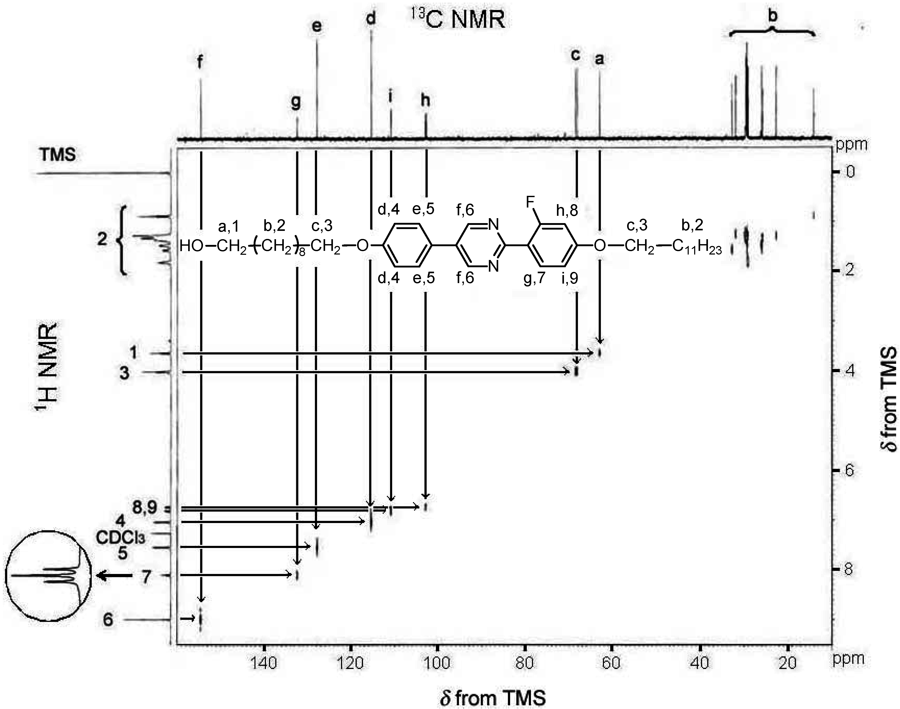 1H−13C hetero-nuclear multiple quantum coherence (HMQC) NMR of 10-[4-[2-(4-dodecyloxy-2-fluorophenyl)-pyrimidin-5-yl]-phenoxy]-decan-1-ol (compound 2). The inset shows 1H-NMR signal of a proton positioned at 7.
