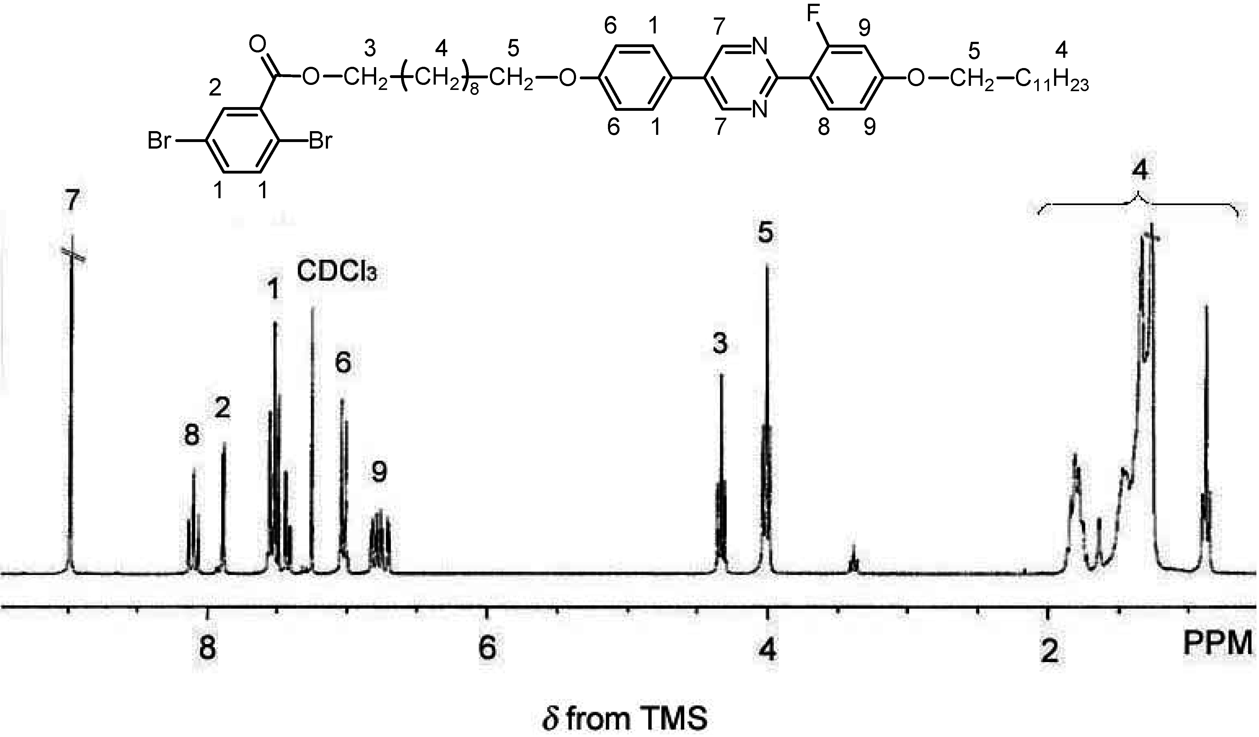 1H-NMR spectra of 2,5-dibromobenzoic acid 10-[4-[2-(4-dodecyloxy-2-fluorophenyl)-pyrimidin-5-yl]-phenoxy]-decyl ester (Mono 1).