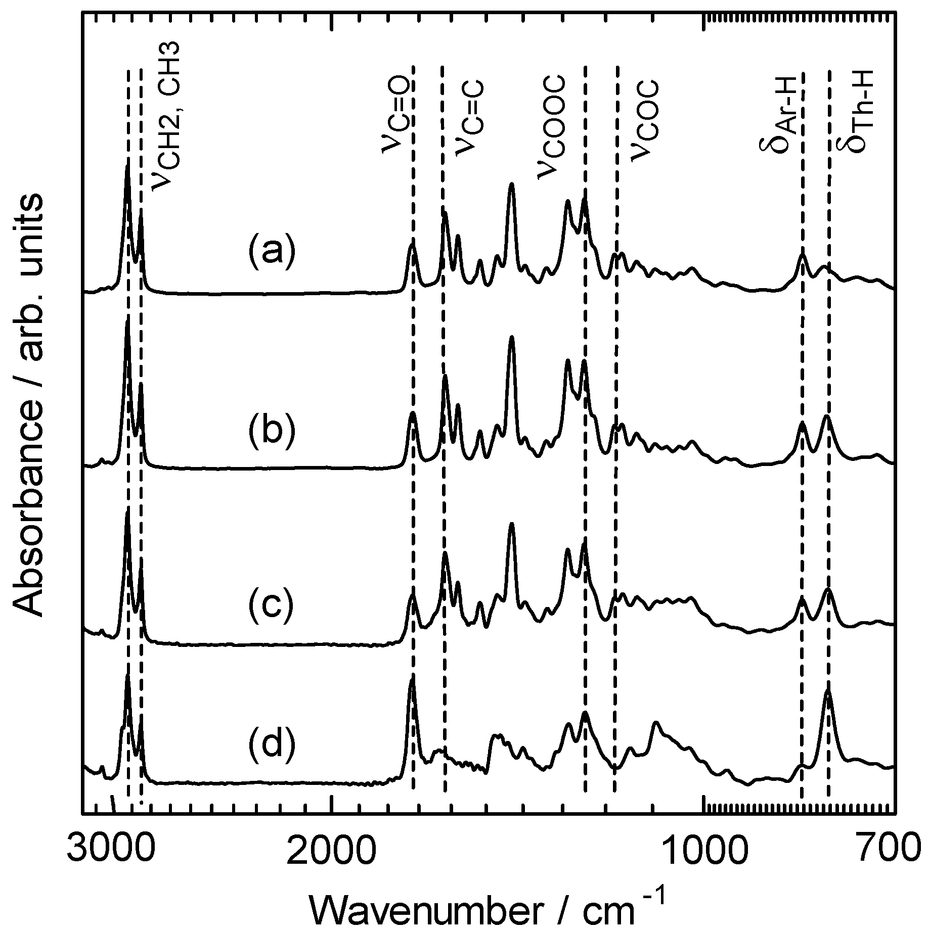 FT-IR spectra of the polymers. PolyPLCTh (a), polyPLC2Th (b), polyPLC3Th (c), polyPN2Th (d).