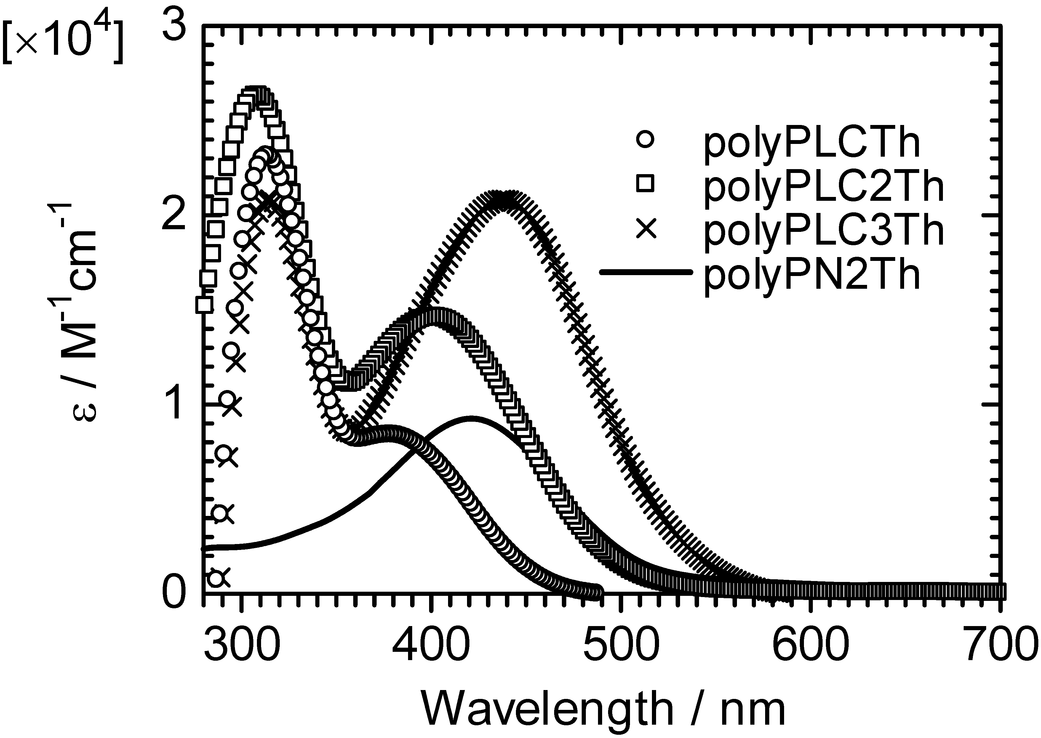 Figure 4 shows the ultraviolet–visible (UV–vis) optical absorption spectra of the polymers in chloroform solution. PolyPLCTh, polyPLC2Th, and polyPLC3Th exhibit absorption bands at ca. 310 nm, whereas no absorption band is observable at the same wavelength for polyPN2Th due to the absence of the mesogenic group as a side chain. This result suggests that the absorption band at 310 nm is assignable to the π–π* transition of the aromatic rings in the LC moiety. The polymers also display absorption bands at longer wavelengths. The absorption bands near 400 nm are attributable to the π–π* transition of the main chain (polyPLCTh, 379 nm; polyPLC2Th, 400 nm; polyPLC3Th, 438 nm; polyPN2Th, 421 nm), and the absorption intensities of the polymers increase with thiophene number in the monomer repeat unit of the polymers. These results indicate that increasing the thiophene number in the main chain results in extension of the effective conjugation length of the polymers.