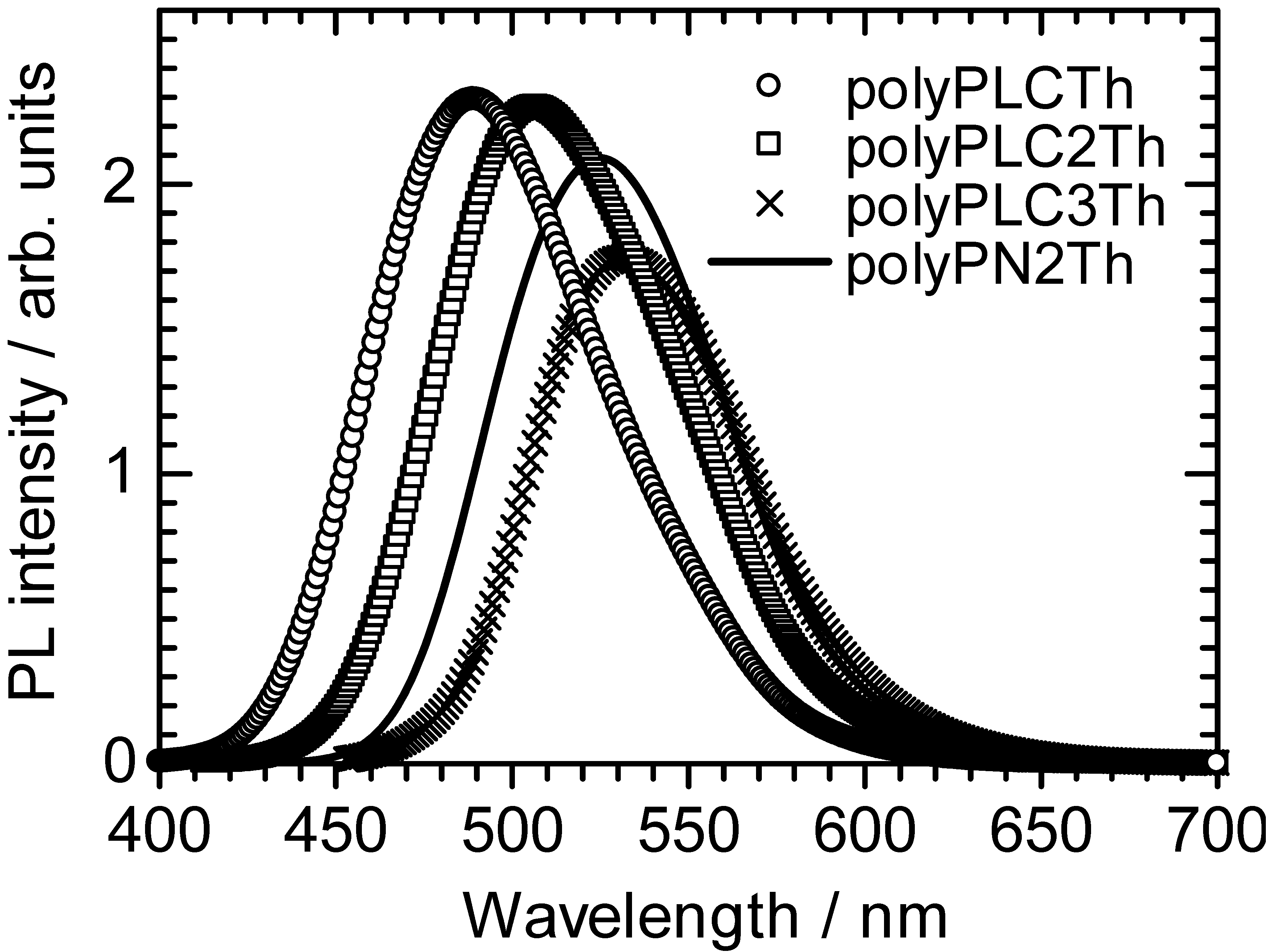 Figure 5 shows the photoluminescence (PL) spectra for the four polymers in chloroform solution. The polymers exhibit PL maxima at 489 nm (polyPLCTh), 501 nm (polyPLC2Th), 532 nm (polyPLC3Th), and 524 nm (polyPN2Th). The shift in the PL position can be attributed to the extension of the effective conjugation length with increasing thiophene number in the monomer repeat unit, consistent with the UV–vis absorption results.