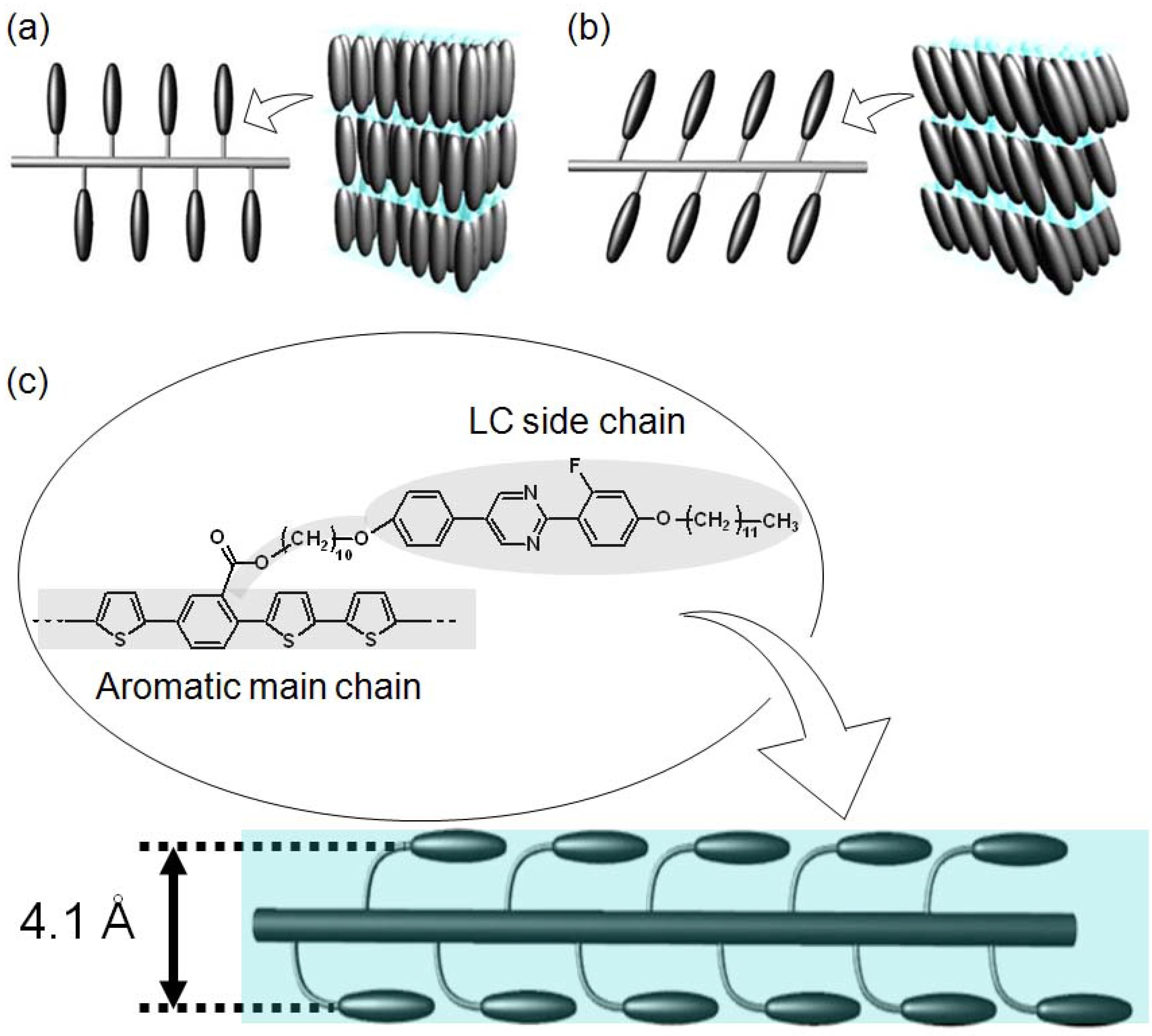 Liquid crystal (LC) polymers exhibit both liquid-like fluidity and crystal-like molecular order. Rigid and stick-shaped compounds with low molecular mass and rigid polymers with high molecular weight often display an LC phase under appropriate conditions. LC polymers have been applied as an engineering plastic providing good processability, strength, and elasticity [1,2]. It is generally known that the introduction of LC groups into the main chain allows polymers to form an LC phase as a side-chain LC polymer [3,4]. Rigid aromatic polymers with flexible alkyl side chains are also known to form an LC phase as a main-chain LC polymer [5,6,7,8]. In side-chain LC polymers, the main chain can form an ordered structure accompanying alignment of the side chains, and the anisotropy afforded by such ordering provides certain functionalities [9].