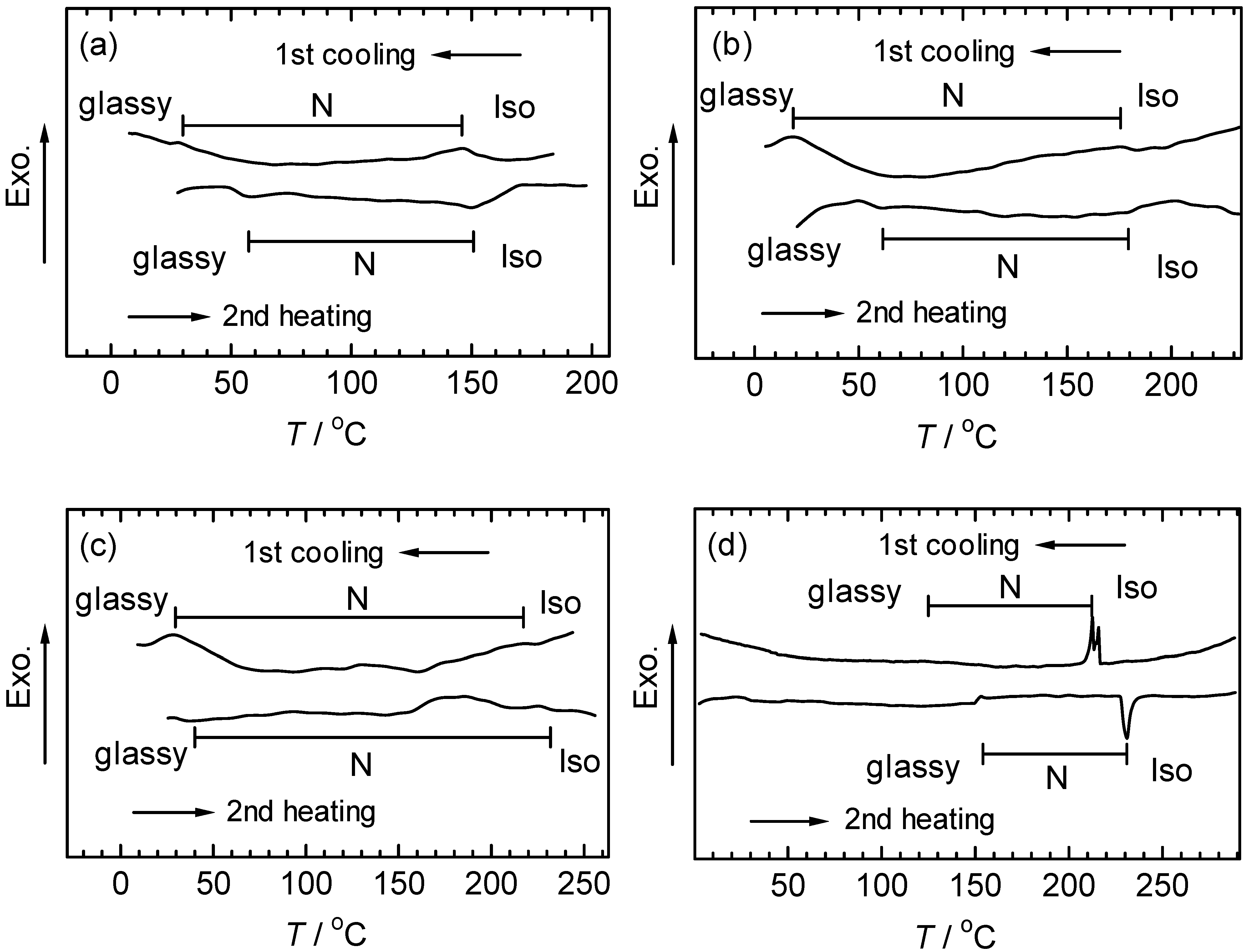 DSC curves of the polymers. PolyPLCTh (a), polyPLC2Th (b), polyPLC3Th (c), polyPN2Th (d).