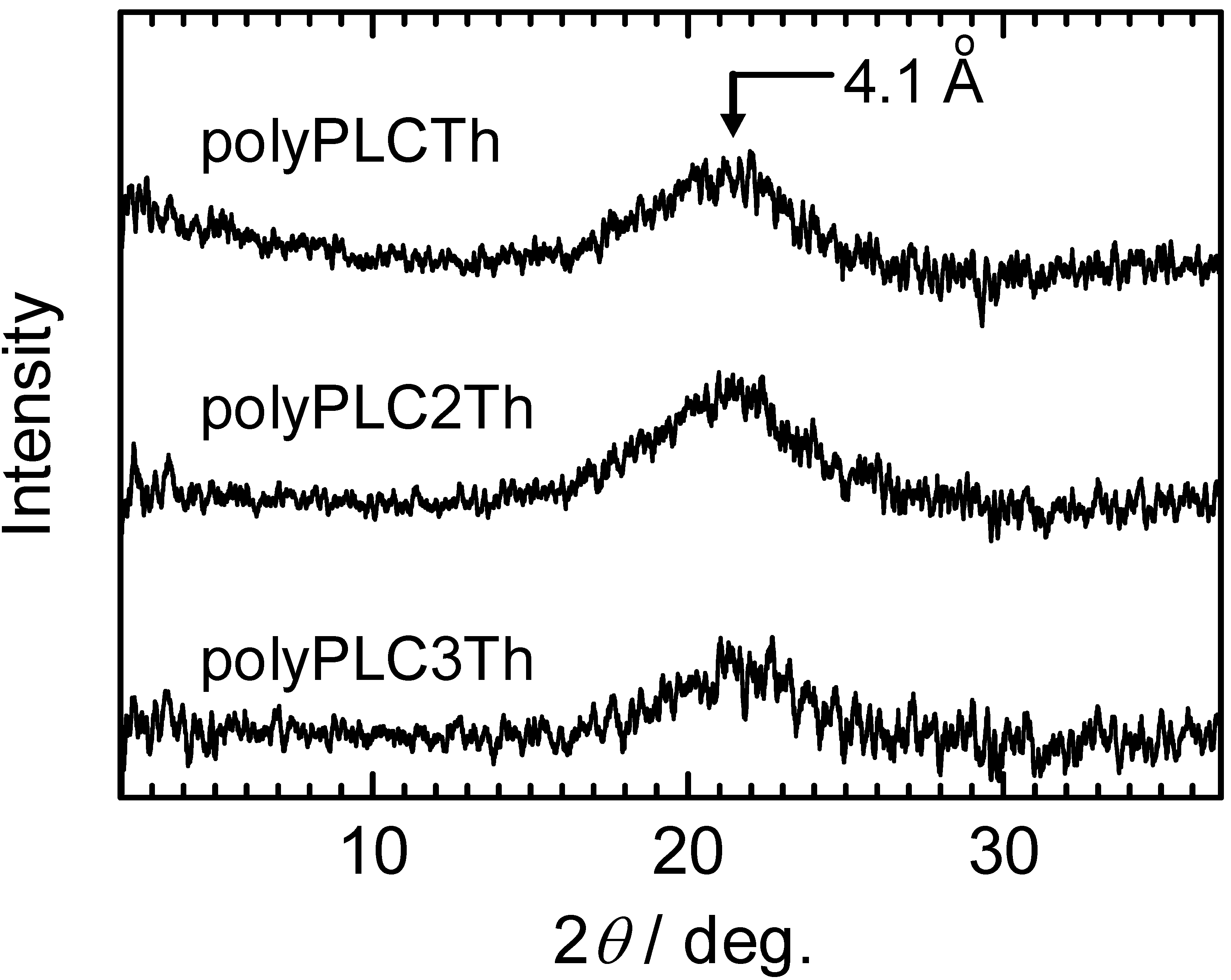 Figure 10 shows the x-ray diffraction (XRD) patterns for the three polymers. The polymer samples were heated once to produce the isotropic phase then cooled slowly to the glassy state in order to maintain the Schlieren texture of the polymers at room temperature prior to XRD measurements. The three polymers exhibit broad halos at the same angle (2θ = 21°, 4.1 Å), which is a typical pattern for nematic LC. Small-angle diffractions corresponding to the side chain length were not observed, confirming that these polymers do not have a layered structure, that is, the side chains are not located perpendicular to the main chain in these polymers. Although all of these polymers display the same XRD pattern, the distances between the adjacent LC side chains increase in the order polyPLCTh < polyPLC2Th < polyPLC3Th, indicating that the 4.1 Å distance corresponds to the intermolecular distance between the LC side chains parallel to the main chain. The side chain and main chain thus cooperate to form a single large mesogen as a supermolecular cable-like mesogen, consistent with the result that these polymers only adopt the nematic LC. The cooperation of side-chain and main-chain liquid crystallinity is therefore considered to be responsible for the formation of the nematic LC phase by these polymers, with no smectic LC formation despite the smectic LC phases exhibited by the monomer.