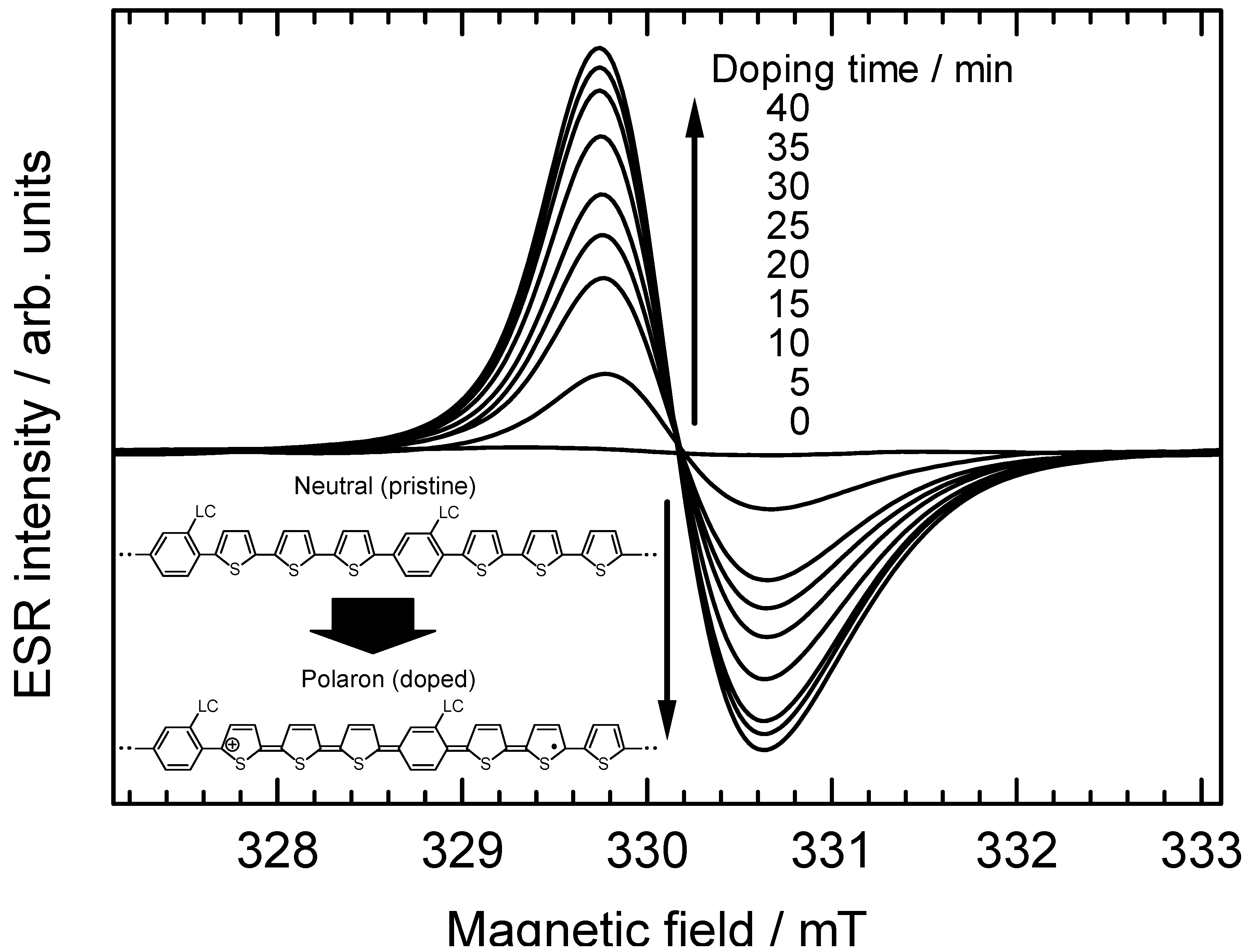 ESR spectroscopy was employed to monitor free radical generation in polyPLC3Th during in-situ vapor doping of iodine (Figure 11). The pristine undoped polymer exhibits no ESR signal due to the absence of free radicals. Upon iodine doping, however, the intensity of the paramagnetic ESR signal increased with time, indicating that free radicals (conduction carriers) are generated by the doping process. The asymmetric lineshape of the ESR signal is consistent with the Dysonian pattern for organic conductive materials. The conduction carriers in the present case are radical cations (polarons). This result confirms the doping effect for the polymer, verifying that the polymers have a π-conjugated main chain. The g value, linewidth (ΔHpp), and ESR intensity of the polymer are plotted as functions of doping time in Figure 12. The g value and ΔHpp remain unchanged during the doping process, whereas the ESR intensity increases with doping time, indicating that the density of conduction carriers increases with doping, while the carrier species remains unchanged. Heavy doping of the polymer would generate dications (bipolarons, charged carriers having no radicals) resulting in a decrease in ESR intensity.