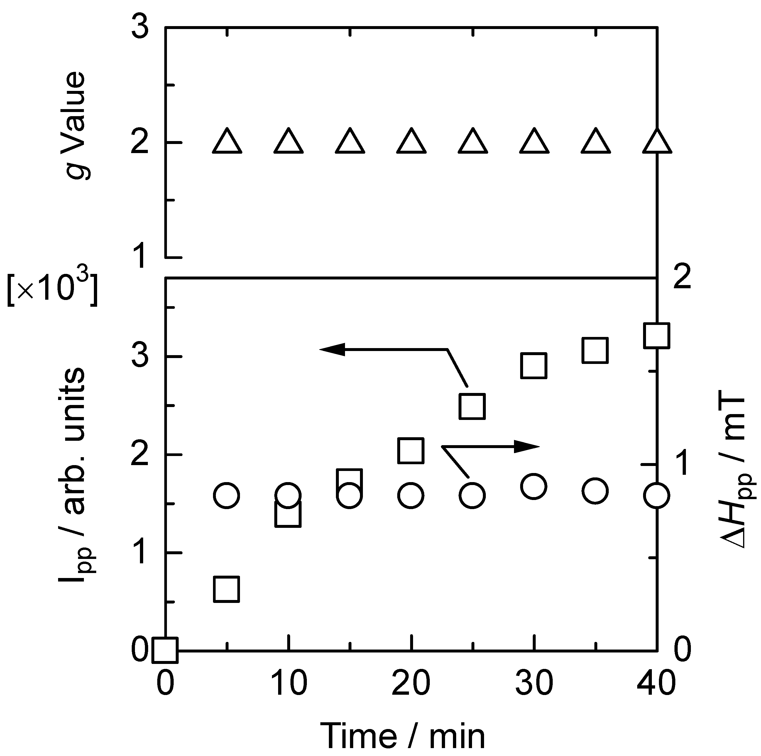 ESR intensity, g value, and linewidth of the ESR signal for polyPLC3Th during in-situ vapor-phase iodine doping.