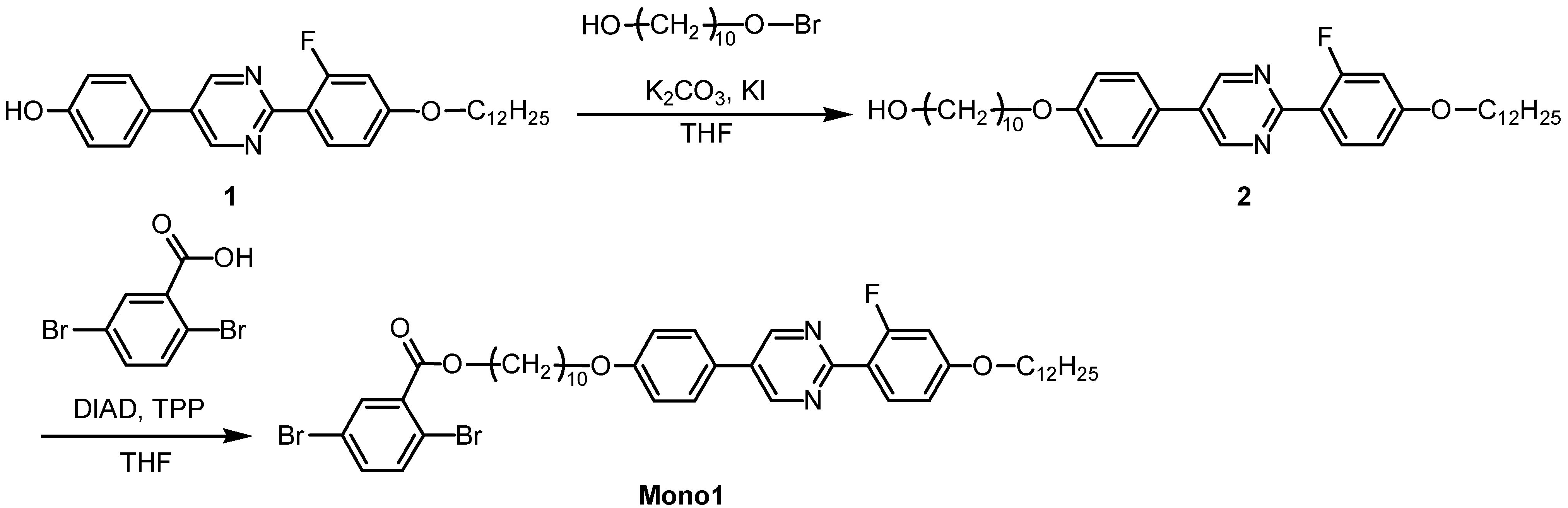 The synthesis of 2,5-dibromo-benzoic acid 10-[4-[2-(4-dodecyloxy-2-fluorophenyl)-pyrimidine-5-yl]-phenoxy]-decyl ester (Mono 1) was carried out by a Mitsunobu coupling reaction between 2,5-dibromobenzoic acid and the hydroxy group (Scheme 1), as follows: 2,5-dibromobenzoic acid (0.24 g, 0.84 mmol), 2 (0.50 g, 0.82 mmol), and triphenylphosphine (0.25 g, 0.94 mmol) were mixed under nitrogen into tetrahydrofuran (THF; 7 mL), to which diisopropyl azodicarboxylate (DIAD, 40% in toluene; 0.46 g, 0.92 mmol) was added in a dropwise manner after cooling in an ice bath. The mixture was maintained at ca. 0 °C for 1 h, followed by stirring at room temperature for 10 h. After the reaction, the solvent was evaporated, and the residue was purified by column chromatography using silica gel and ethyl acetate. Recrystallization from acetone followed by vacuum drying afforded the target product as a white solid (0.55 g, 0.63 mmol, yield = 75.6%). Figure 2 shows the 1H-NMR spectra of Mono 1.
