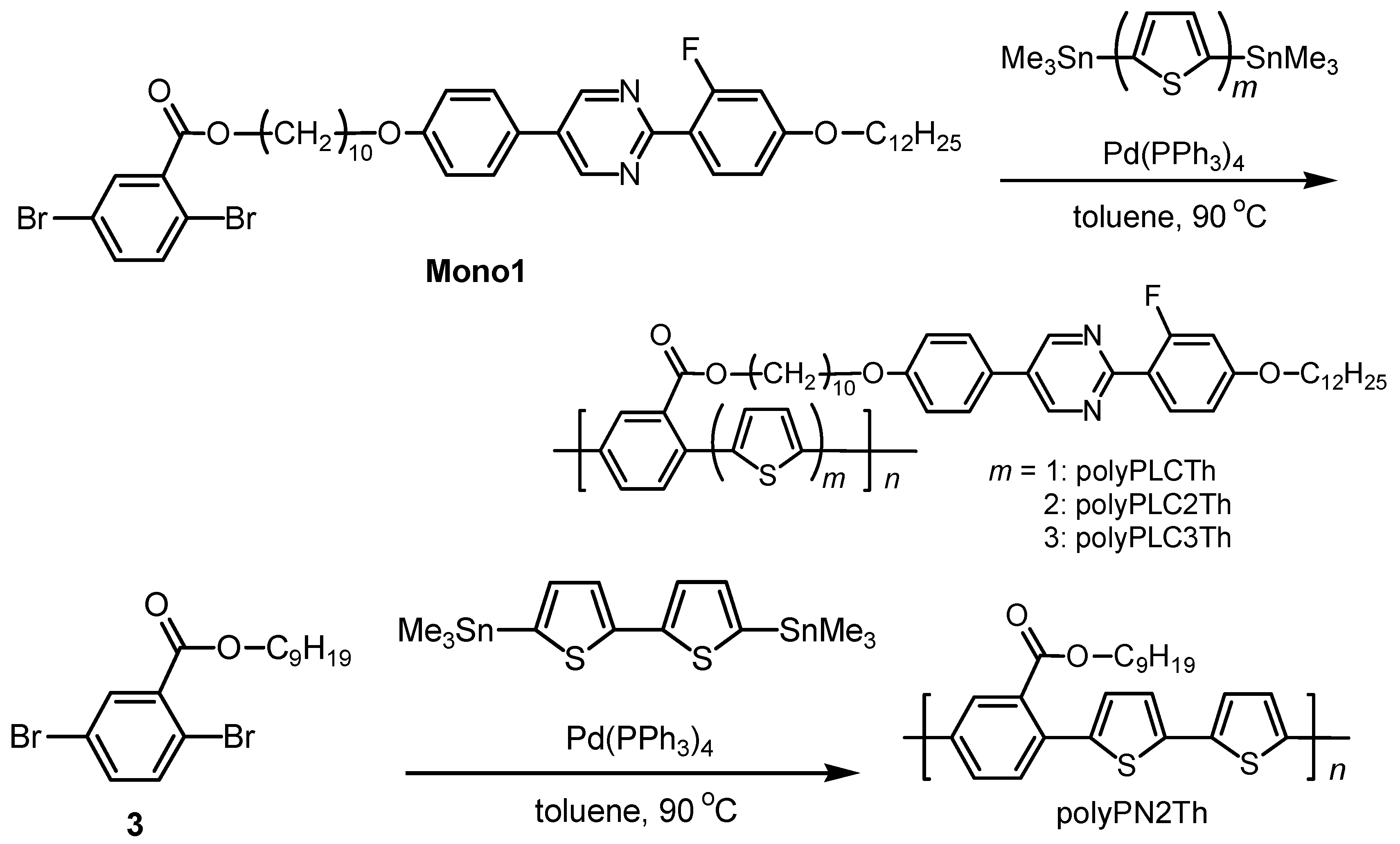 Four different conjugated polymers were prepared via Stille polycondensation reactions of various thiophene monomers and Mono 1 or 2,5-dibromobenzoic acid nonyl ester in the presence of a Pd(0) complex catalyst (Scheme 2).