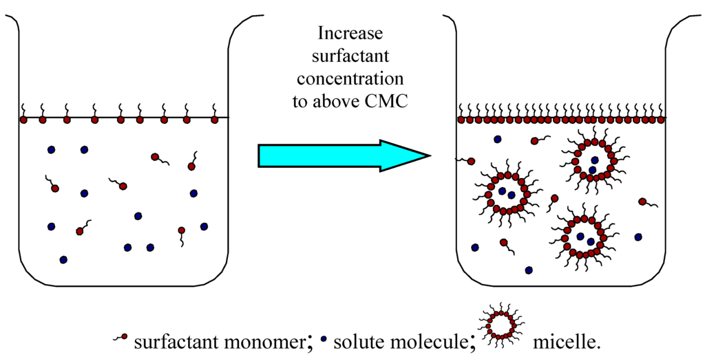 Micelle formation in water and solubilization. When the surfactant concentration is increased to above CMC, the surfactant monomers will associate with each other to form dynamic micelles. Depending on their polarity, the solute molecules will be solubilized into the core of the micelles or at the core-water interface.