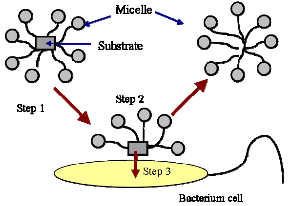 As shown in this Figure, the mass transfer from micelle into cell is composed of three steps. The first step is the transport of the micelles solubilized with a substrate to the vicinity of the cells or enzymes by mixing. The second step is the exchange of the filled micelles with the hemimicellar layer of surfactant molecules formed around the cells. The formation of hemi-micelle layer around the cell or other substrates has been proposed and used successfully by many authors to describe the biodegradation [14,15,16] and dissolution of PAH [12,17]. The third step is the transfer of the substrate from the hemi-micelle to the cell. In a well-stirred system, the first step is also not a rate limiting step. The second and the third step normally control the biodegradation of a substrate in the micellar phase. The process is affected by the specific interactions between the micelle and the cell surface. It has been reported that the specific interaction between the micelle and the cell surface, such as the affinity of the two surfaces, is a factor controlling the transport of the substrate from the micelle to the cell [15,16,18,19].