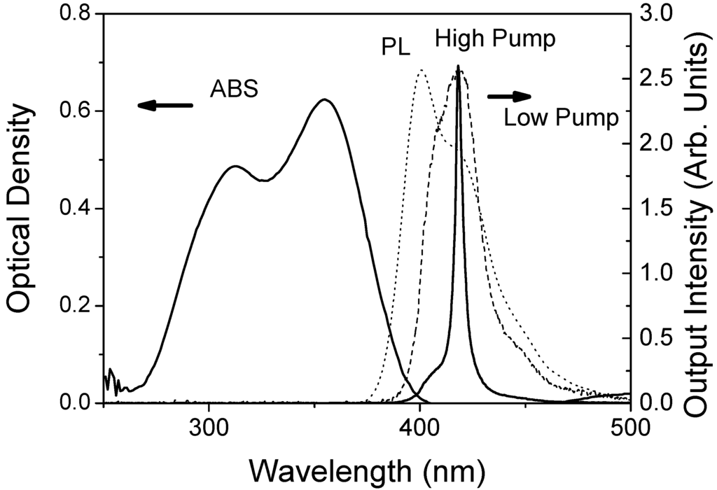 Since the discovery in 1996 of stimulated emission in semiconducting polymer films [,,], extensive research has been devoted to the development of solid-state lasers based on semiconducting materials, including not only polymers, but also small organic molecules, oligomers and dendrimers [,,]. A very unique property of organic materials is that, due to their broad photoluminescence (PL) spectrum, the laser wavelength can be tuned over a wide range []. Among the various types of organic materials, those that are semiconducting open the possibility of electrical pump. Moreover, those that are soluble, have the additional advantage of easy processability, so they can be deposited in the form of thin films by inexpensive techniques. One of the main challenges in the search of new active laser materials is the achievement of laser thresholds low enough to allow pumping with compact and inexpensive optical sources. Thus, some lasers excited with microlasers the size of a match box [] or even diode lasers [,] have recently been demonstrated.