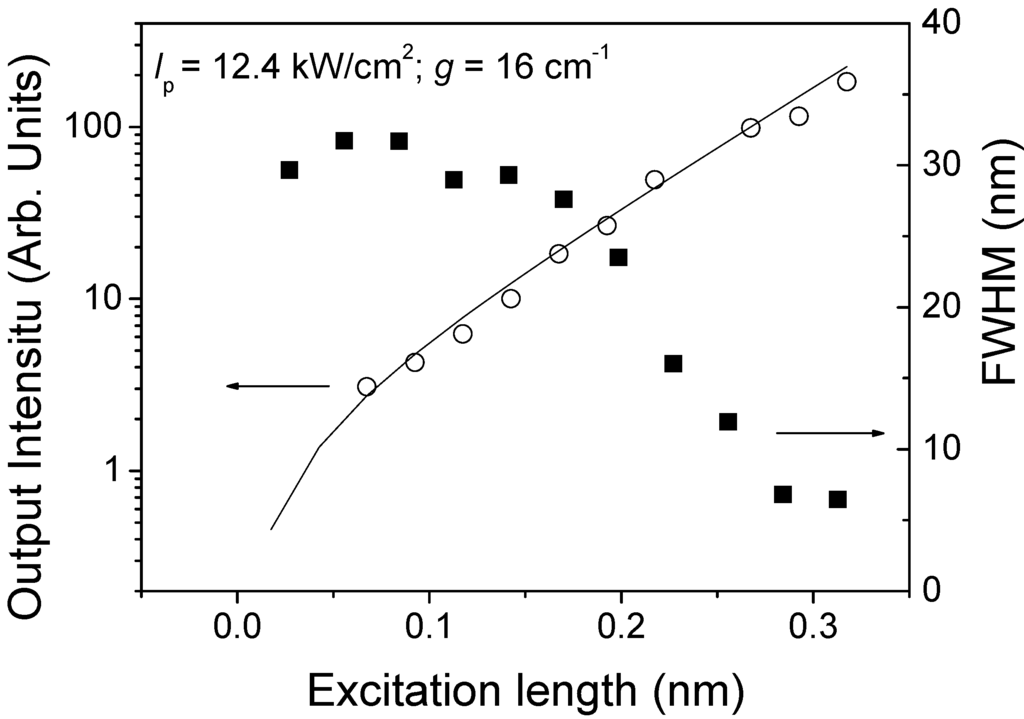 FWHM (right axis, solid square) and emission intensity at λ = 416 nm (left axis, open circles) as a function of excitation length, at a pump intensity of 12.4 kW/cm2 for a 10 wt% TPD-doped PS film. The solid line is the fit to data using Equation (1).