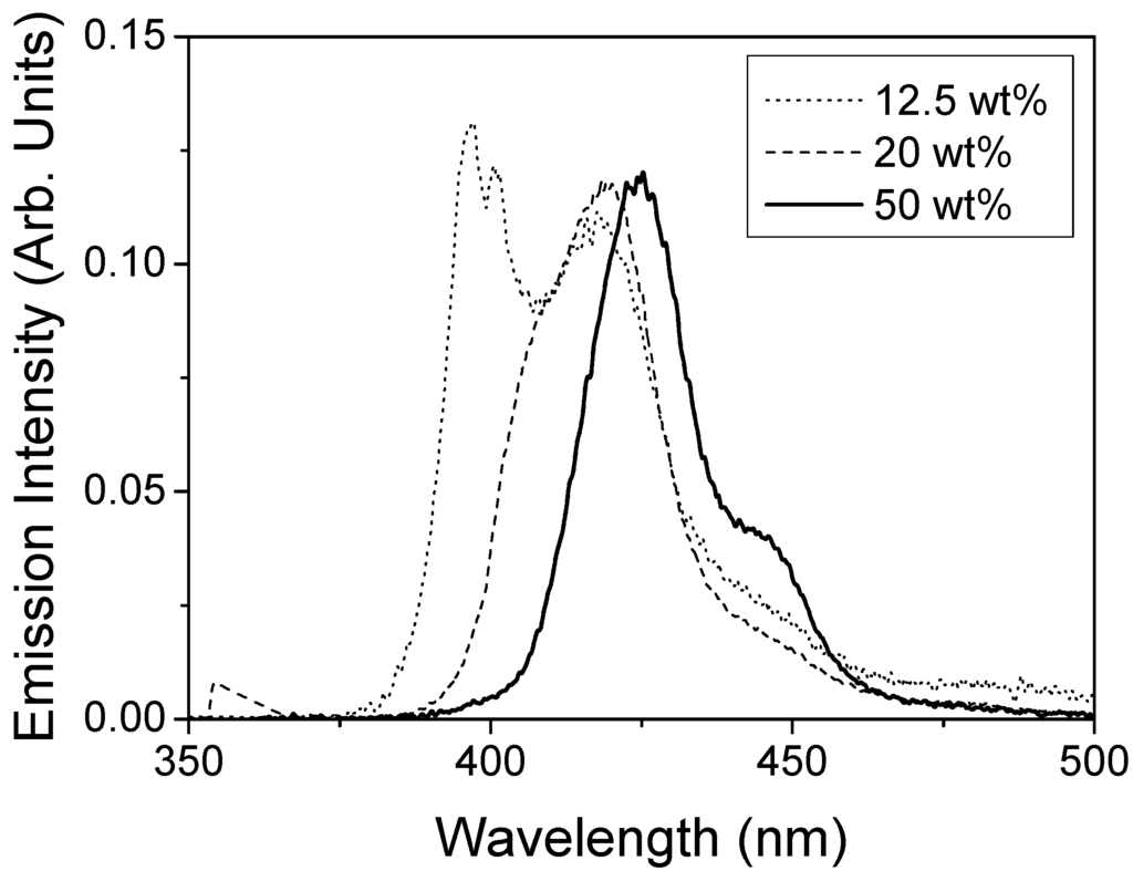 The dependence of ASE on the concentration of TPD in the films was investigated for a wide range of TPD concentrations, varying between 2.5 and 100 wt%. Films of similar thickness (around 425 nm) were prepared. Similarly to the 20 wt% TPD-doped film (Figure 2), a collapse of the spectrum due to ASE at sufficiently high pump intensity was observed for all the films studied, even for non-diluted films (100 wt% TPD). Nevertheless, for the neat films the quality was not very good and films degraded quickly after preparation, so reproducibility was a main problem in order to compare with the rest of the films.