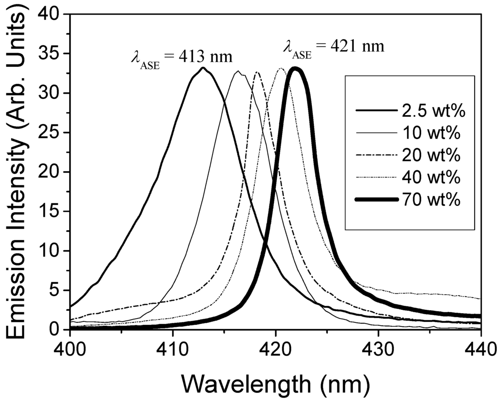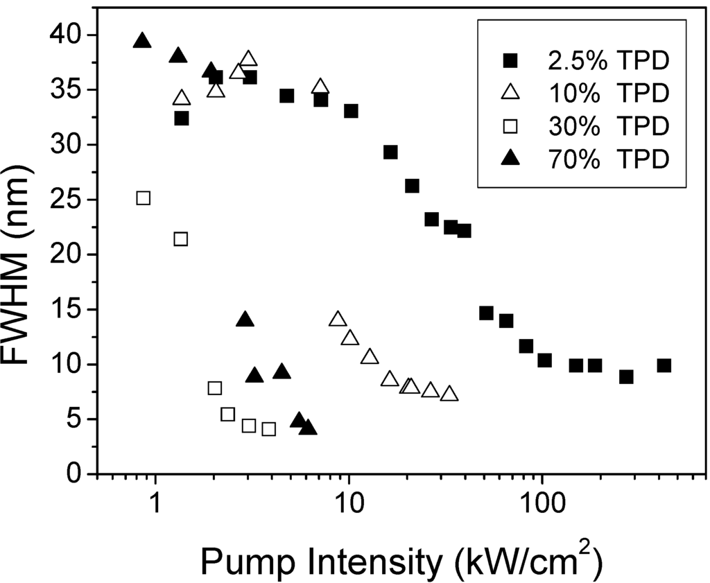 ASE thresholds were calculated for each sample as the intensity at which the FWHM of the emission spectrum decreases at half of its maximum value (see Figure 5). As observed, for low concentrations (i.e., 2.5 wt%) the threshold was around 30 kW/cm2. A one-order of magnitude decrease was obtained when the TPD concentration was increased up to 20-30 wt%. For larger concentrations similar Ith-ASE values were obtained. The concentration dependence of the FWHMASE also shows this type of behavior. Indeed, the FWHMASE decreased from 9 to 5 nm when the TPD concentration was varied from 2.5 wt% up to 20-30 wt%. Then, it kept constant for larger concentrations. This type of dependence can be explained in terms of the PL efficiency of the films. We observed that the normalized emission intensity (PL integrated area divided by film thickness) increased up to around 20 wt% and then saturated and kept constant with concentration, while absorption increased linearly with concentration. Presumably, this saturation of the emission intensity is due to molecular interaction, that seems to be more important for TPD concentrations above 20 wt% []. It is somewhat surprising the fact that, in spite of the saturation effects observed for concentrations above 20 wt%, ASE is still observed. Moreover, thanks to possibility of adding such large amounts of active material without getting ASE quenching, ASE thresholds are much lower than those obtained with traditional dyes. Note that typical concentrations for lasing with traditional dyes are around 1 wt%.