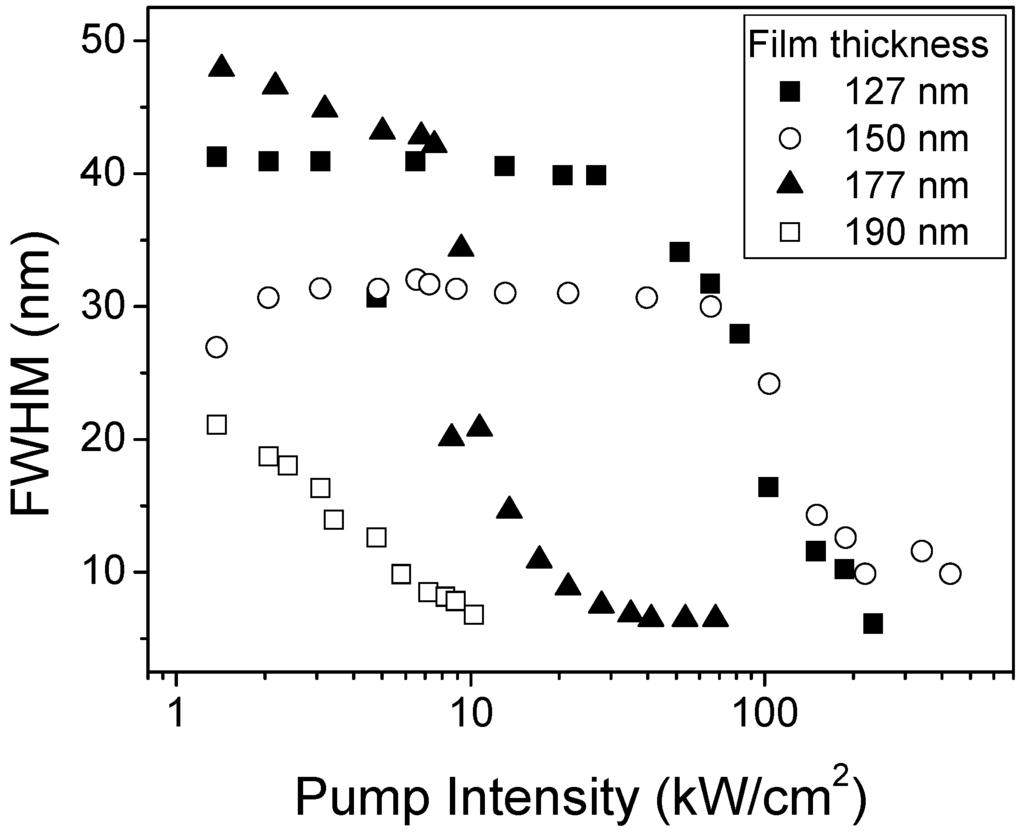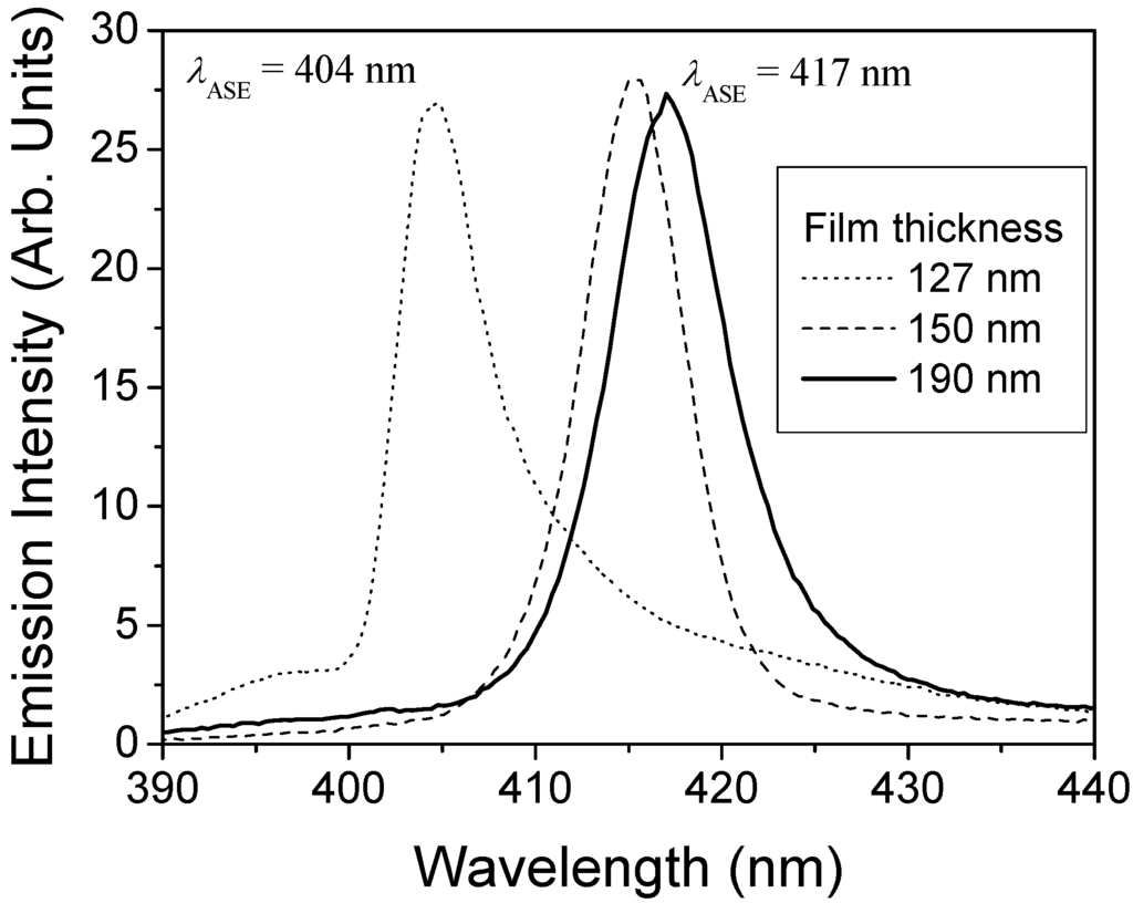 However, the cut-off condition does not explain the variations observed in the ASE wavelength for thickness between 127 and 190 nm. In these cases the shifts observed were explain in terms of the shape of the emission spectrum at low intensities [].