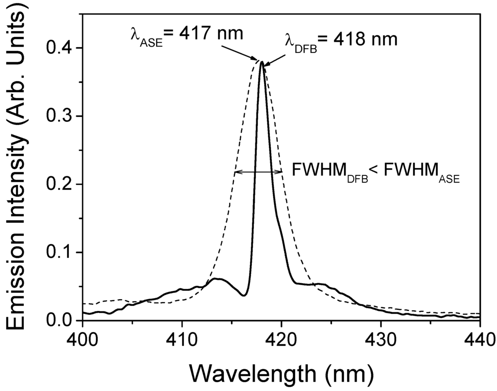 The laser properties of these devices were characterized in the experimental setup described in the Experimental section, that differs in some aspects from that used in previous sections. In order to study the effect of the grating in the emission spectrum, results were compared to those obtained in the same setup for films deposited over bare glass substrates. Figure 9 shows the emission spectra at high pump intensity for a DFB device based on a 250 nm-thick polymer film and for a sample consisting in a similar film but deposited over bare glass. As observed, the presence of the grating is evidenced in the changes observed in the emission spectra of the DFB device due to waveguided PL which has been Bragg-scattered out of the waveguide at an angle normal to the substrate. This particular device emits at around 418 nm with a linewidth lower than 2 nm limited by the resolution of our spectrometer, just at the high-wavelength side of a characteristic dip. This Bragg dip is a photonic stop band for waveguided modes and is due to the inhibition of the propagation of the waveguided light by the grating []. The fact that lasing occurs at the edge of the dip is an indication that index modulation, rather than gain modulation, is the physical mechanism accounting for the presence of gain [,,,]. In the case of the sample without grating, a collapse of the emission spectrum is observed, in this case due to the presence of ASE. In this case, the ASE linewidth is around 5 nm, larger than that measured with the DFB structure. In addition, the ASE threshold obtained for the film without grating, was two times larger than the one obtained with the DFB device.