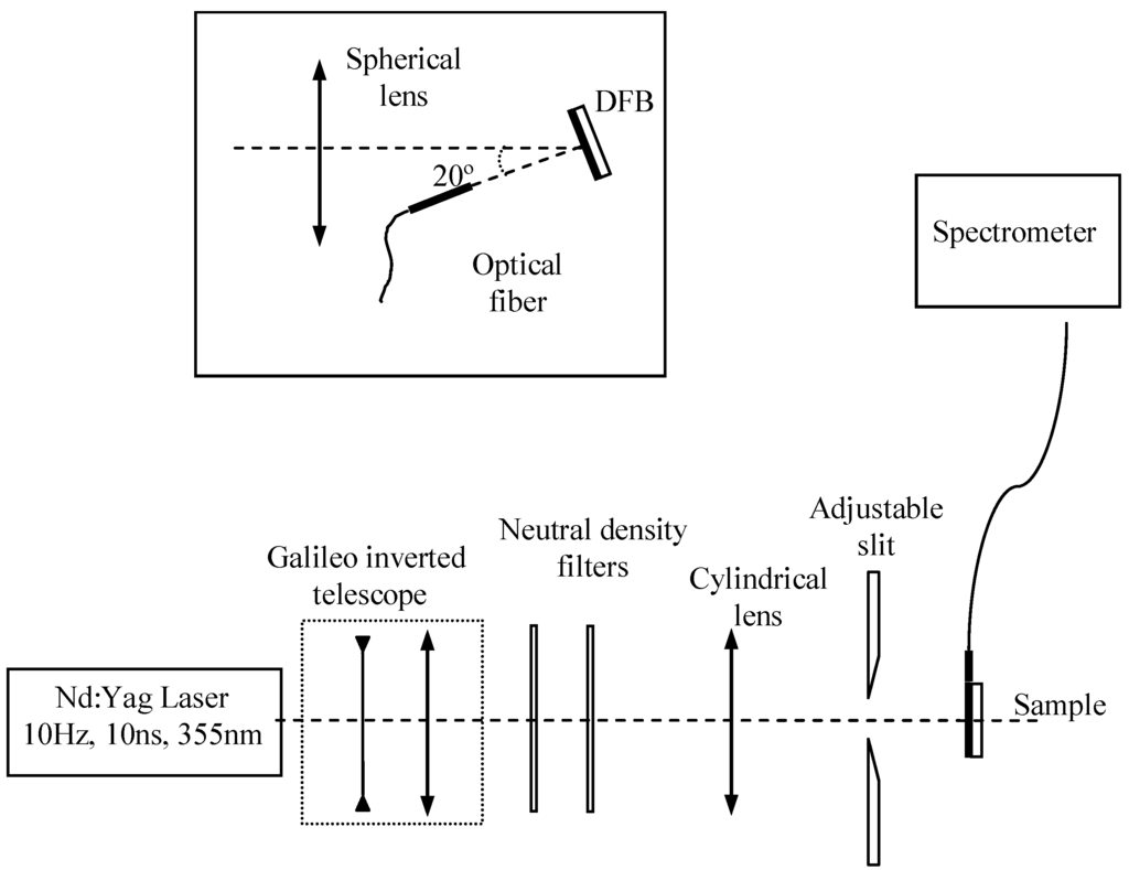 Samples were photopumped at normal incidence with a pulsed Nd:YAG laser (10 ns, 10 Hz) operating at 355 nm, which lies in the absorption region of TPD. The energy of the pulses was controlled using neutral density filters. The laser beam was expanded and collimated. A cylindrical lens and an adjustable slit were then used to shape the central part of the beam into a stripe with a width of approximately 0.53 mm and a length that could be varied between 0.1 and 3.5 mm. The pump stripe was projected right up to the edge of the film where the emitted light was collected with a fiber spectrometer. In the characterization of DFB lasers, the cylindrical lens was substituted by a spherical lens that focused the central part of the pump beam in a spot of 1,3 mm diameter on the sample (inset of figure 10). The pump beam was incident at 20º and the emitted laser beam, which was output coupled by second-order Bragg scattering, was collected in a direction perpendicular to the film with the fiber spectrometer placed at 1 cm of the sample.