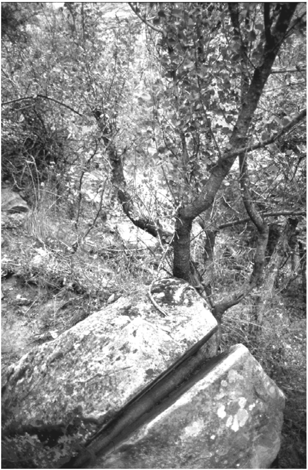 Example of living tissue interacting with non-adaptive materials: The soft tree visible in the picture was able to cut deep into the hard rock.