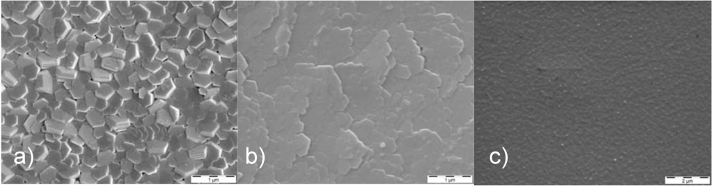 Surface morphology of Mg films deposited at room temperature with a rate of about 1 µm/h by (a) magnetron sputtering, average energy ~8 eV, (b) ion beam sputtering, average energy ~12 eV, and (c) vacuum arc deposition, average energy ~25 eV [].