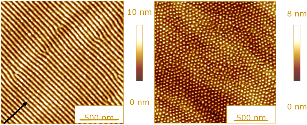 This removal of surface atoms by sputtering, together with radiation damage and the insertion of the foreign atom into the host material leads in general to a modification of the surface topography. For semiconductors, nanostructures including regular ripples [,] or dot arrays [,] can be observed, in addition to atomically smooth surfaces [] or disordered nanostructures [], as shown in Figure 4 []. These former structures are explained by a competition of sputtering and surface relaxation mechanisms []. A similar behavior can be found for insulators and metals.
