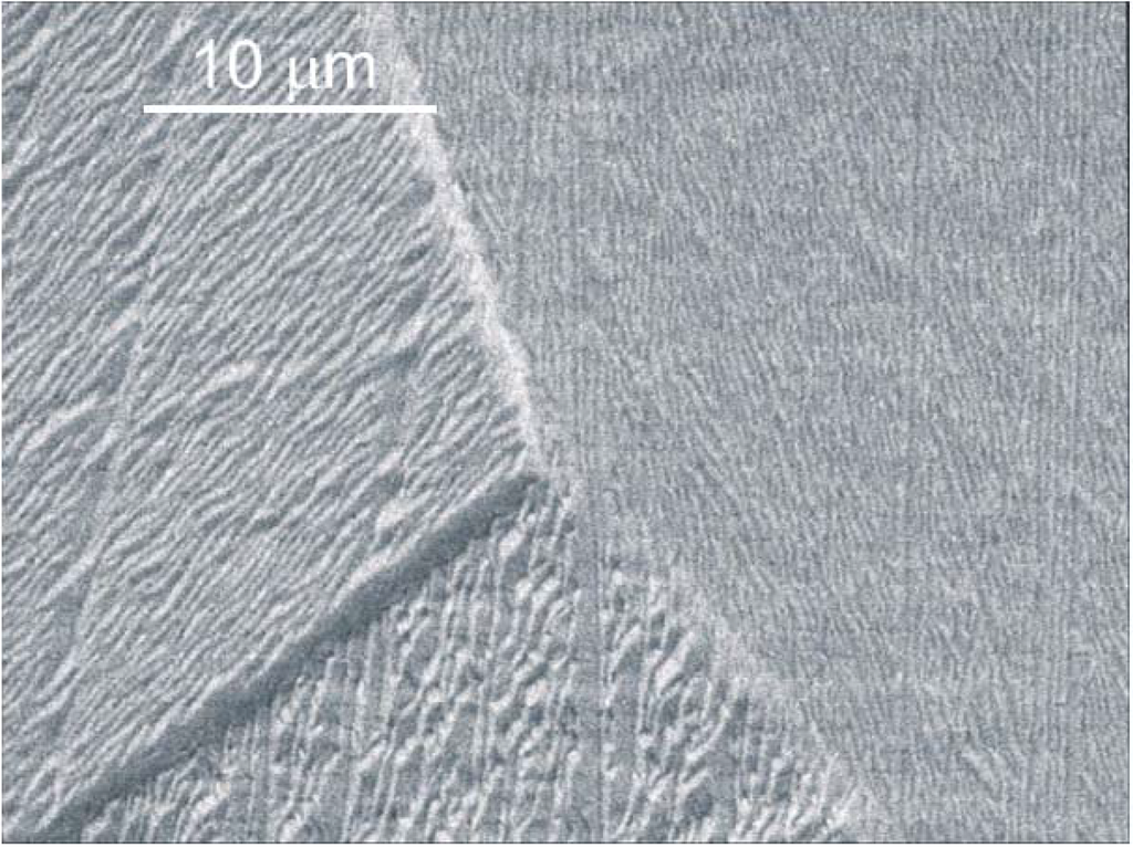 SEM micrograph of Al surface after sputtering with 5 kV Cs+ for a dose of 6 × 1017 at./cm2 at an incident angle of 60° []. A triple grain boundary with different absolute sputter yields and different surface roughness for each grain is visible.