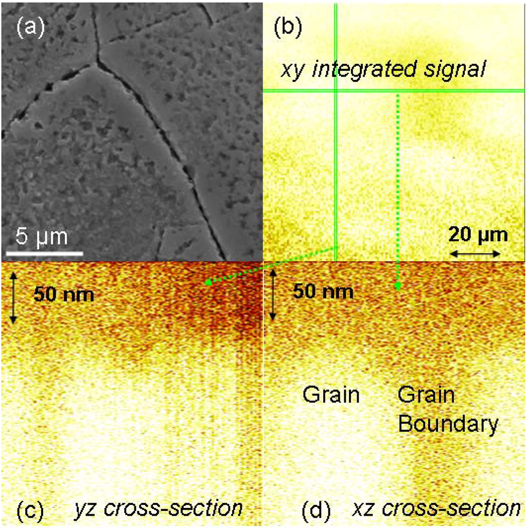 For compounds, the situation is much more unclear as point defects and dislocations in the bulk may enhance diffusion processes, while impurity segregation and phase precipitation at grain boundaries may decelerate diffusion processes. At the same time, different diffusion mechanisms inside grains and at grain boundaries cannot be excluded. A typical, well-understood example is Ni + O, where the dominant process is vacancy diffusion of Ni at grain boundaries, whereas oxygen grain boundary diffusion is even slower than Ni bulk diffusion []. Corresponding SEM and SIMS images obtained for polycrystalline Ni implanted with oxygen are shown in Figure 8, where the surface and the grain boundaries are clearly visible with a reduced signal intensity in SIMS.
