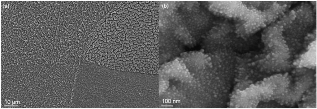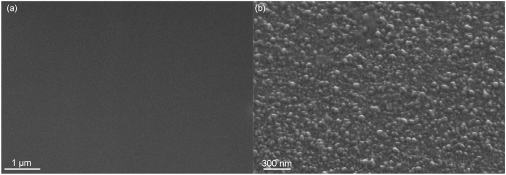 Concentrating on systems with dominant outward transport of metal cations and subsequent nucleation and phase formation processes, pronounced nano-structured surfaces can be formed by ion implantation into metals at elevated temperatures. In the system Al-N, a pronounced outward diffusion of Al cations along grain boundaries is observed for nitrogen implantation into aluminum at moderate temperatures between 250 and 400 °C []. At the same time, variations in the orientation dependent sputter yield lead to strong topography and roughness dissimilarities between single grains, as shown in Figure 9(a) []. As the melting point of AlN is much higher than that of Al with a corresponding lower mobility inside AlN grains, outward growth of the resulting AlN surface layer is occurring predominantly along the grain boundaries of the AlN micro and nano-crystals, leading to a highly corrugated surface structure where it cannot be ascertained that a closed nitride layer is present (cf. Figure 9(b)). At the same time, this surface incidentally exhibits strong antireflection properties. Furthermore, the fast outward diffusion of Al leads to the formation of voids below the modified surface layer, thus compromising the adhesion [].