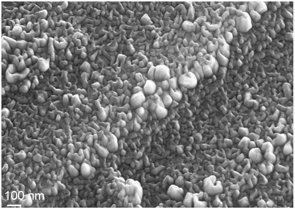 Typical physical vapor deposition (PVD) processes encompass, with increasing energy per deposited particle: evaporation, reactive sputtering, vacuum arc deposition and ion beam assisted deposition (IBAD) techniques [,,]. The systematic variation of the ion energy from thermal energies near 0.05 eV up to 500 eV or more in these processes is depicted in Figure 2, with typical surface morphologies depicted in Figure 3. Correspondingly, the films become denser with a reduced void fraction, caused by an enhanced surface mobility [] and larger crystallites due to Ostwald-ripening of the formed nanocrystals []. Large efforts have been made to use the resulting thin films for biomechanical coatings []. At the same time, a higher average energy per deposited particle leads to a reduced surface roughness as the enhanced surface mobility leads to a mass transport on the surface.