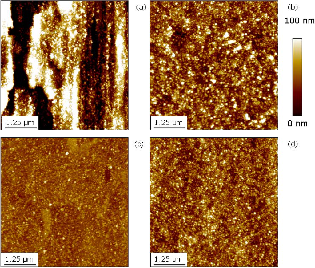 Surface topography measured with AFM after oxygen PIII at 450 °C for 30 minutes: (a) grinded Ti. (b) grinded + polished Ti. (c) Ti6Al4V (polished). (d) NiTi (polished).