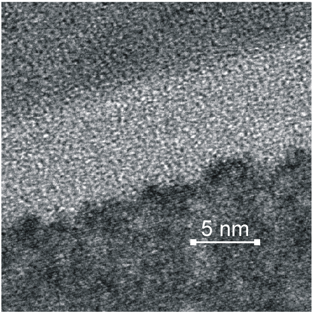 High resolution TEM cross section of the interface for a TiO2 thin film deposited on Si using additional ion bombardment during deposition (top TiO2, bottom Si) [].