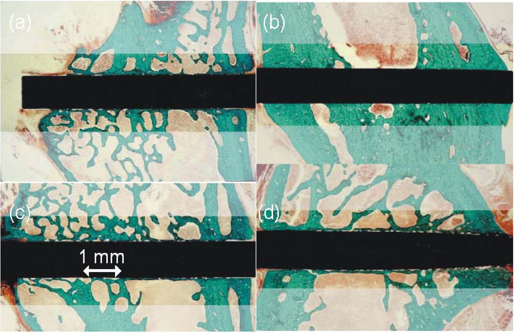 Besides the topography, the surface texture can also influence the tissue response, presumably via the electronic surface structure or work function depending on the surface orientation. Higher cell attachment and proliferation of osteoblasts on Ti6Al4V were observed for surfaces oriented preferentially along (100) than for (110) oriented surfaces []. The former samples were obtained from rod material while the latter were cut from sheets. Thus the texture induced by different rolling processes or further mechanical deformations can result in pronounced changes in the biocompatibility.