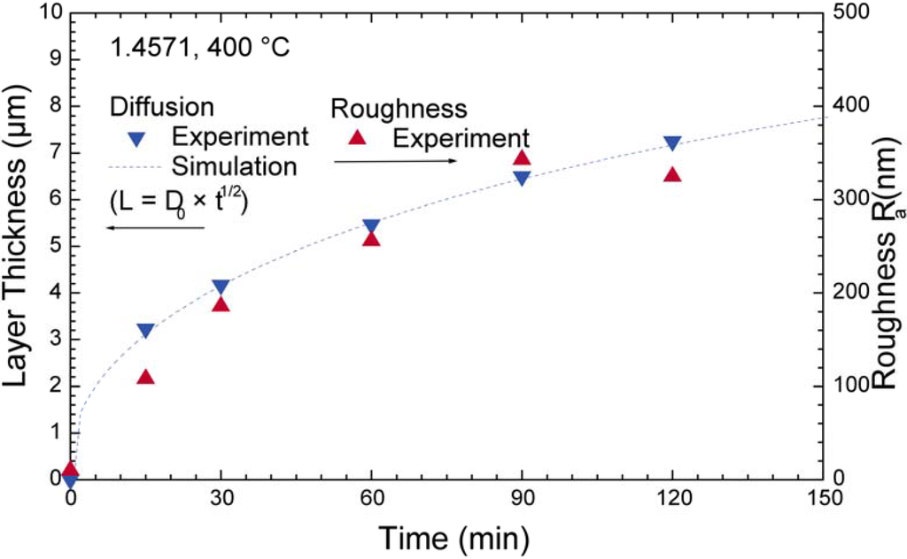 Depending on the ion fluence, different types of diffusion processes will occur. At low fluences before secondary phases are formed, the implanted atoms diffuse inside the host matrix, while at higher fluences, additional compounds with a stoichiometric composition are formed, with either dominating anion or cation mobility—or diffusion of both species [,]. For closed surface layers, the growth of these layers occurs via diffusion limited transport across the layer with the formation enthalpy acting as driving force. As a result, an inverse parabolic increase of the layer thickness d is observed with time t, i.e., d ∝ t1/2. Depending on the species with the higher mobility, the growth process is concentrated on the surface or the interface (see Figure 7). It has to be pointed out that the ion range is normally much smaller than the respective oxide, nitride or carbide layer.