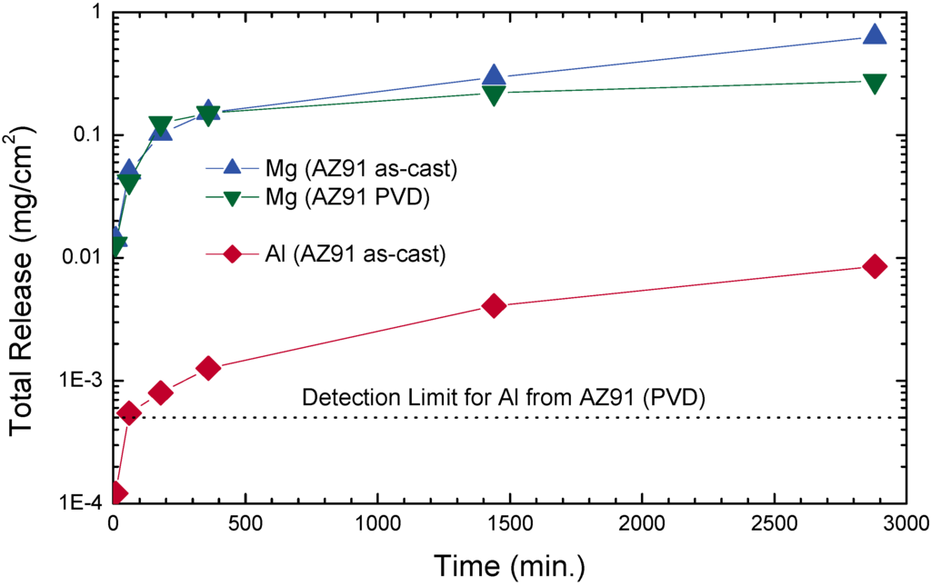 Electrochemical corrosion, respective release of metal ions, is one of the major causes for unexpected bad biocompatibility of some implants, together with mechanical wear processes releasing particles [,,]. Even scratches on the stem of hip implants created during insertion may lead to medical complications []. Even fast repassivation of surfaces, found especially for Ti alloys, and thick native oxide layers are sometimes not sufficient to reduce the leaching of these metallic ions to a satisfactory low level []. Depending on the alloy composition, different metals may be released from biomaterials.