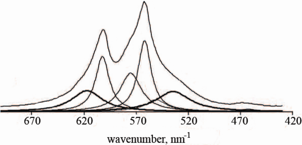 Figure 2. FTIR spectra of poorly crystalline apatites showing the non-apatitic environments of the orthophosphate ions (bold lines with peaks at 617 and 534 cm-1) and the apatitic PO43- (thin lines with peaks at 600, 575 and 560 cm-1) and HPO42- (thin line with peak at 550 cm-1) in the ν4 PO4 domain. Reprinted from Ref. [213] with permission.