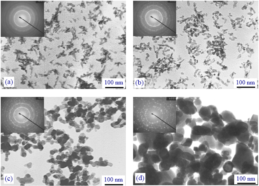 First of all, one should stress that the stoichiometric HA with well resolved X-ray diffraction patterns might be prepared mostly at temperatures exceeding ~700 °C either by calcining of CDHA with the Ca/P molar ratio very close to 1.67 or by solid-state reactions of other calcium orthophosphates with various chemicals (e.g., DCPA + CaO). Thus, with the exception of a hydrothermal synthesis [233,234,235], in aqueous solutions only CDHA might be prepared [88,89,99,100,101,102,103,104,105]. As all apatites (CDHA, HA and FA) belong to the sparingly soluble compounds (Table 1), simple mixing of calcium- and orthophosphate-containing aqueous solutions at pH > 9 results in formation of extremely supersaturated solutions and, therefore, a very fast precipitation of the tremendous amounts of very fine crystals [236], initially of ACP, that afterwards is re-crystallized into apatites [88,89,237,238,239,240]. The dimensions of the precipitated nanocrystals might be slightly increased by the Ostwald ripening approach (maturation), that is, by boiling and/or ambient aging in the mother liquid (Figure 4) [145,157,187,214,234,239,240,241,242,243,244]. Heat treatment of ACP might be applied as well [245]. Therefore, preparation of nanodimensional and/or nanocrystalline apatites is not a problem at all and has been known for many years [145,146,246,247,248]; however, prefix “nano” had not been used before 1994. On the contrary, with the exception of a thermally stable FA (thus, big crystals of FA might be produced by a melt-growth process [249,250]), manufacturing of big crystals of both CDHA and HA still is a challenge.
